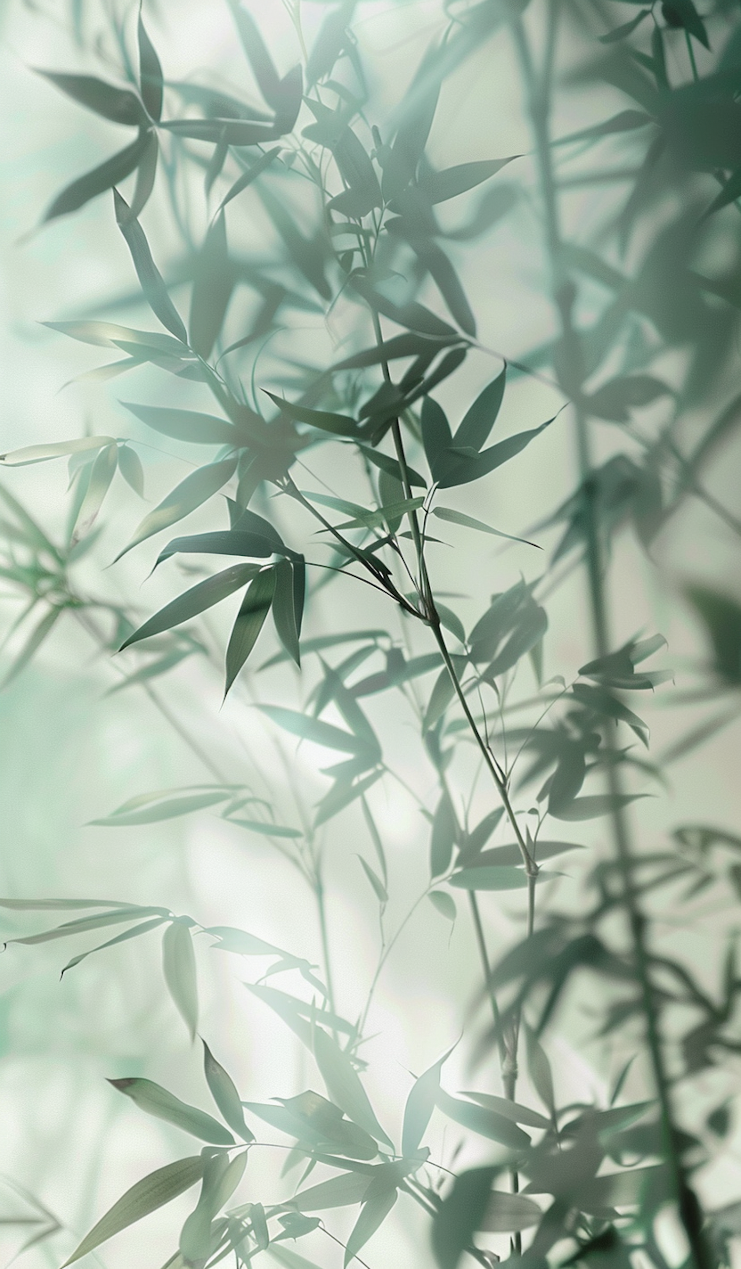 Ethereal bamboo leaves in soft light create a serene, calming atmosphere with gentle green hues and dreamy depth.