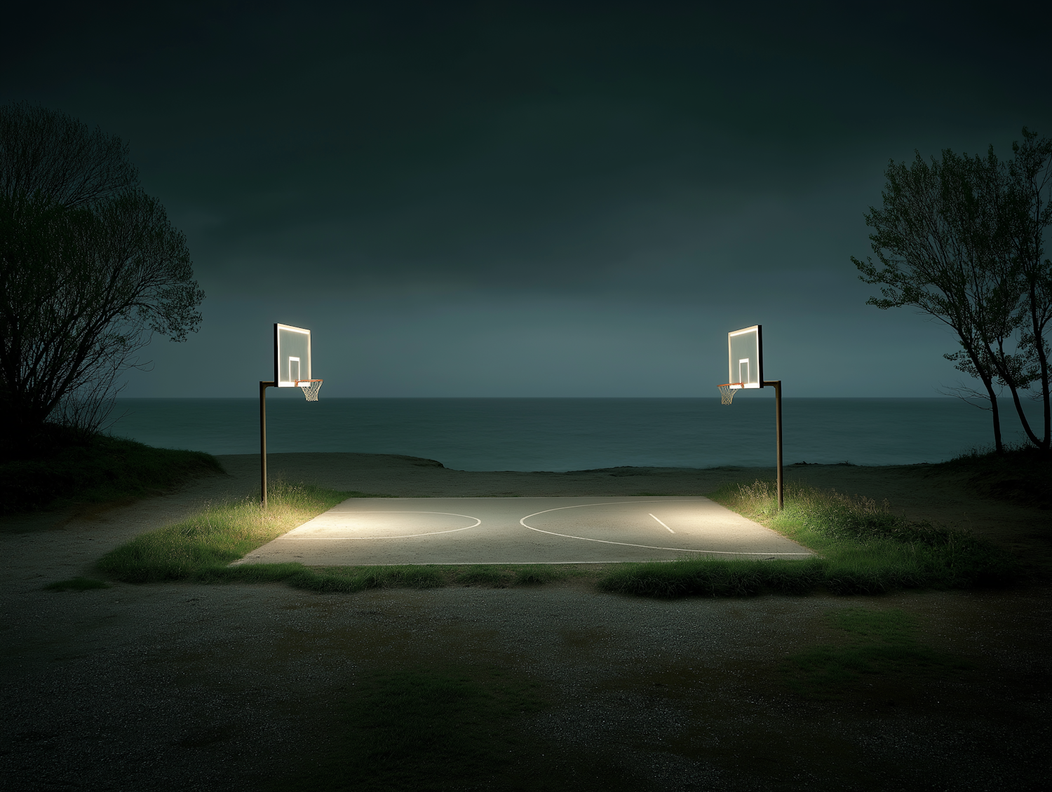 A tranquil basketball court by the ocean, lit under a moody sky, surrounded by grass and trees, creating a serene and reflective scene.