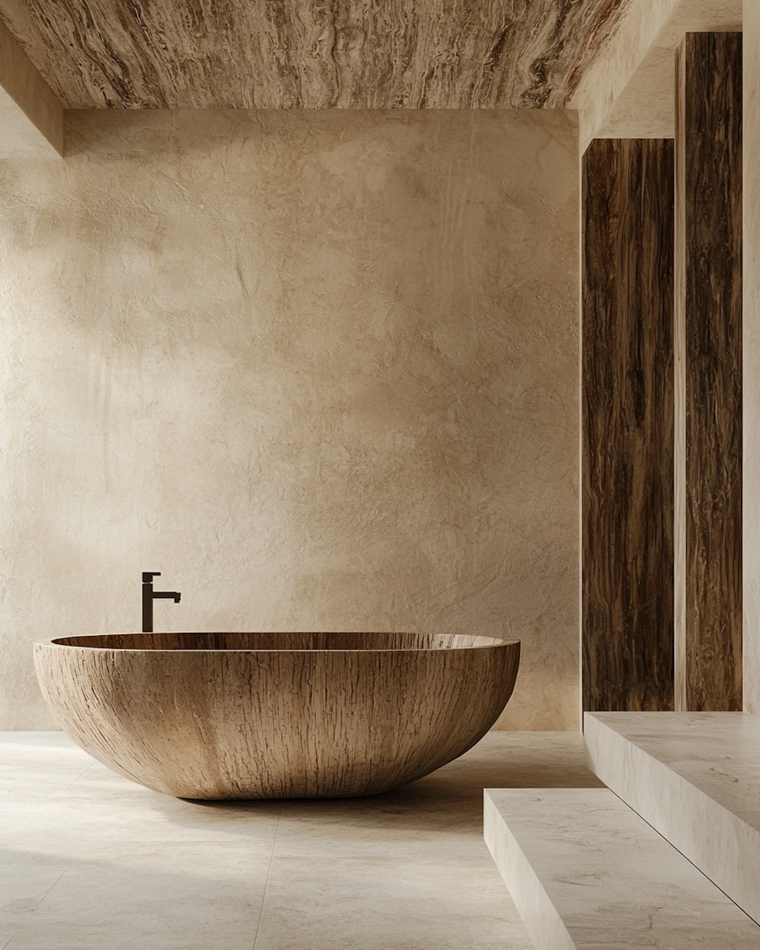Minimalist bathroom with a round wooden bathtub, textured beige walls, and sleek black faucet. Perfect blend of natural tones and modern design.