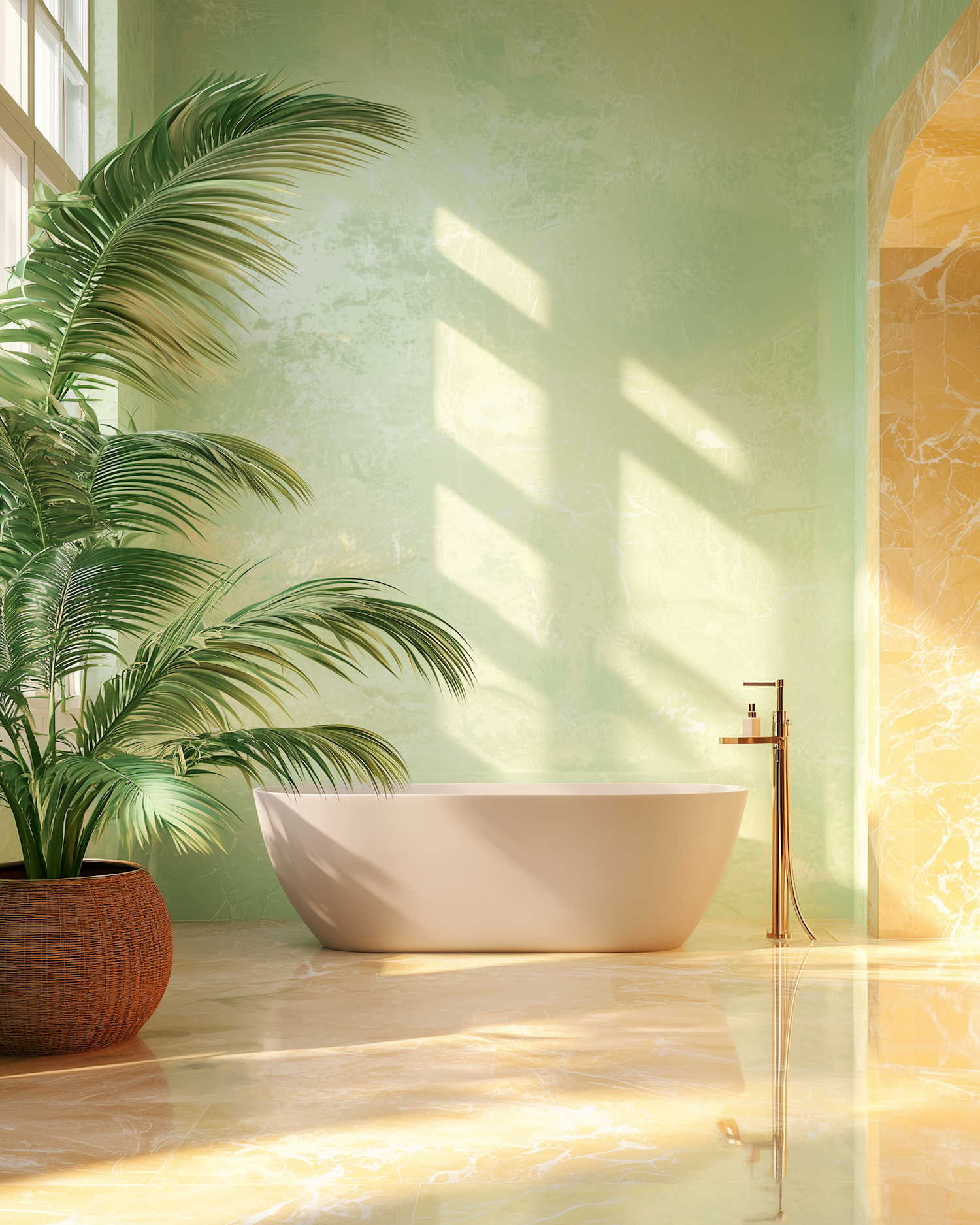 Bright bathroom with a white tub, gold faucet, green walls, and a potted palm. Sunlight highlights the marble floor's golden tones.