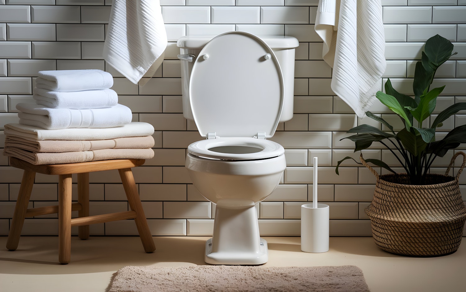 A clean, modern bathroom with a white toilet, folded towels on a wooden stool, a potted plant, and soft lighting for a cozy vibe.