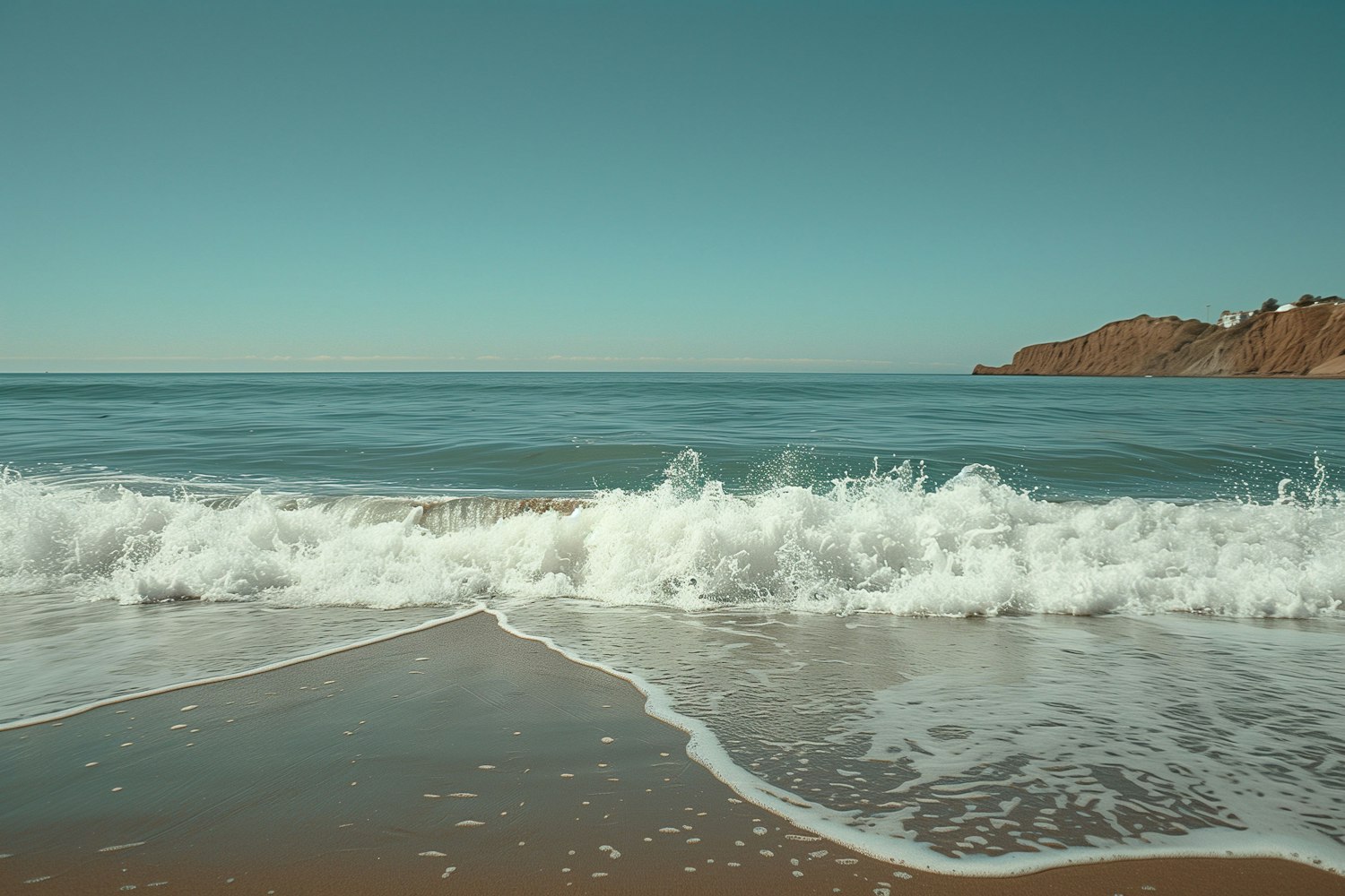 Serene beach scene with gentle waves, clear blue sky, and distant cliffs. Perfect for a tranquil coastal escape.