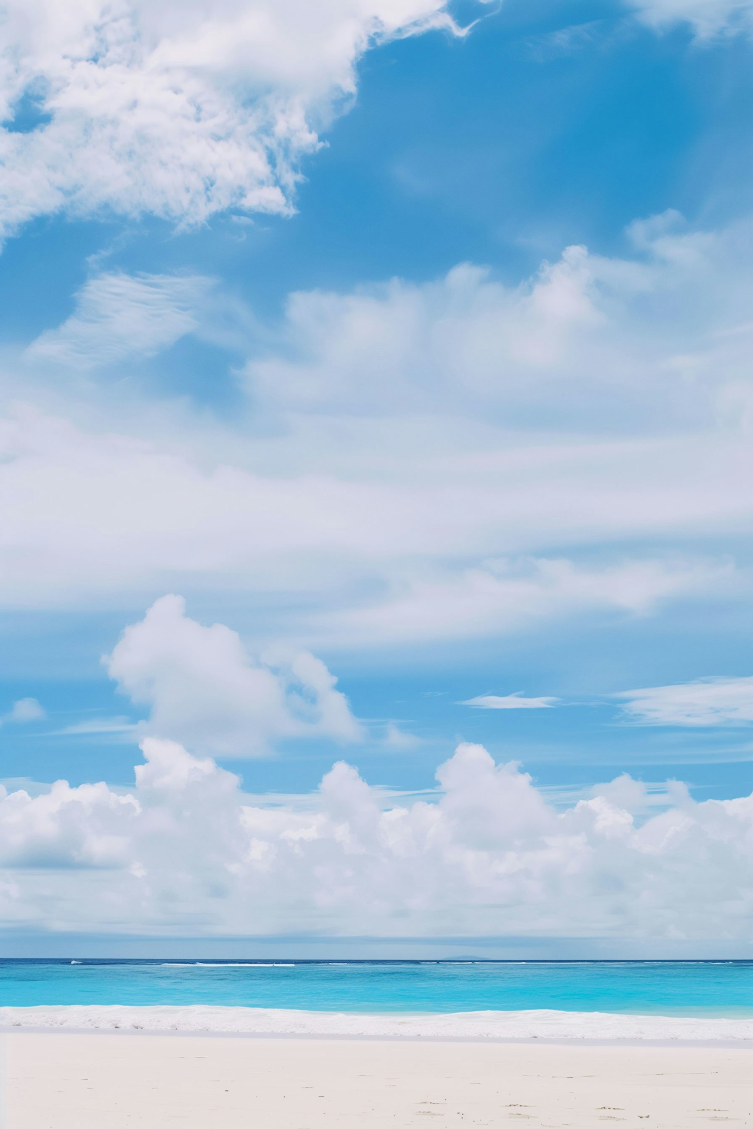 Tranquil beach scene with white sand, turquoise ocean, and a blue sky filled with fluffy clouds. Perfect for a serene getaway.