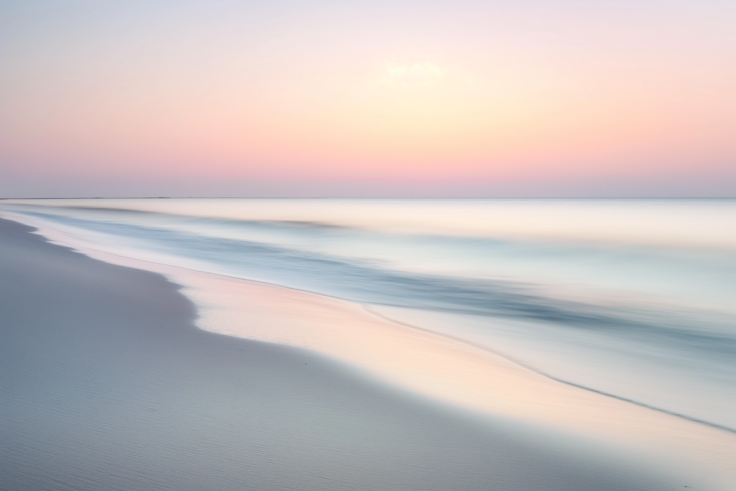 Tranquil beach scene with pastel sunrise or sunset hues, smooth waves, and a pristine sandy shore. Perfect for relaxation and serenity.