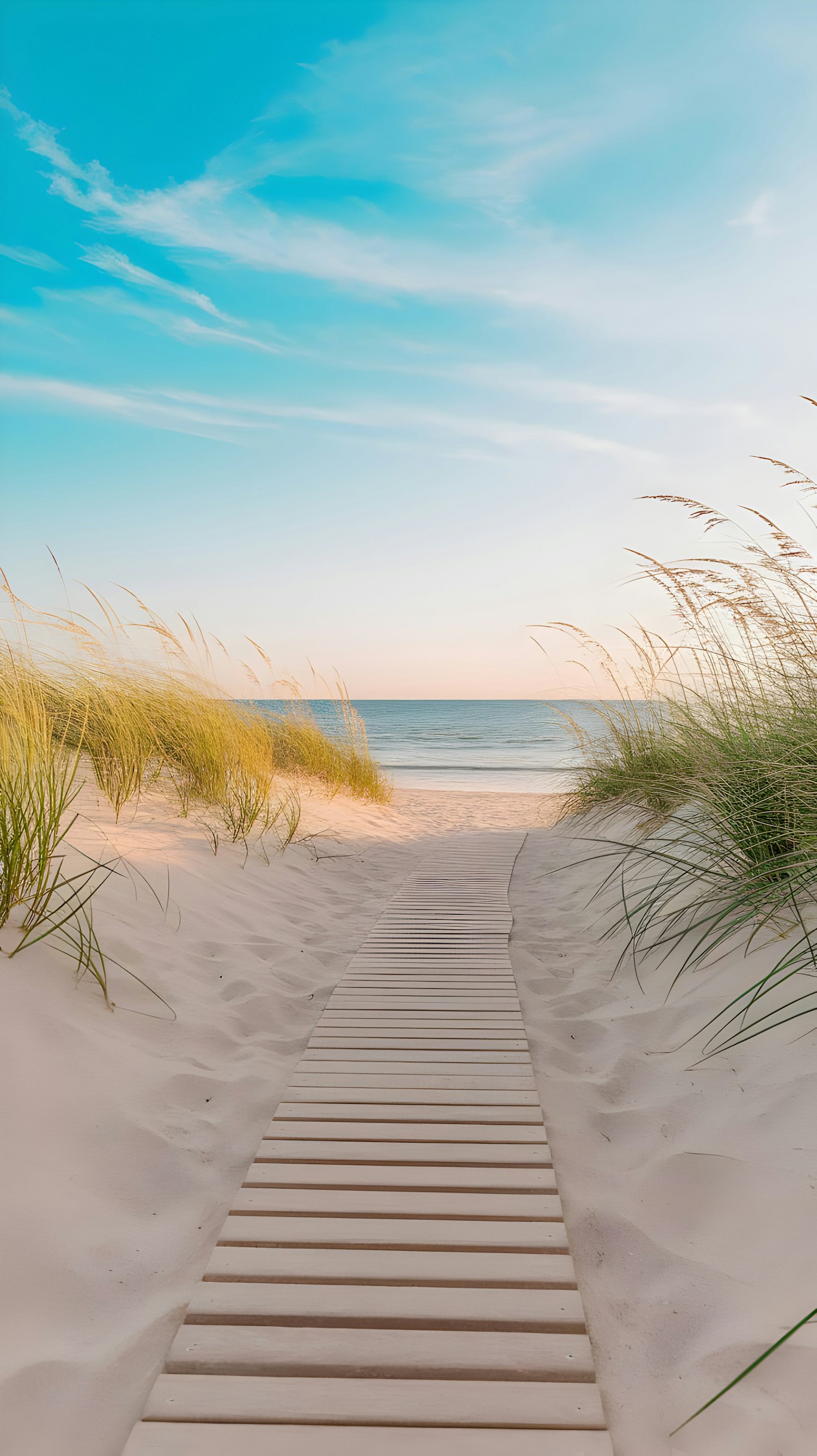 A peaceful boardwalk leads through sand dunes to a calm ocean under a vibrant blue sky with wispy clouds. Perfect for a serene getaway.