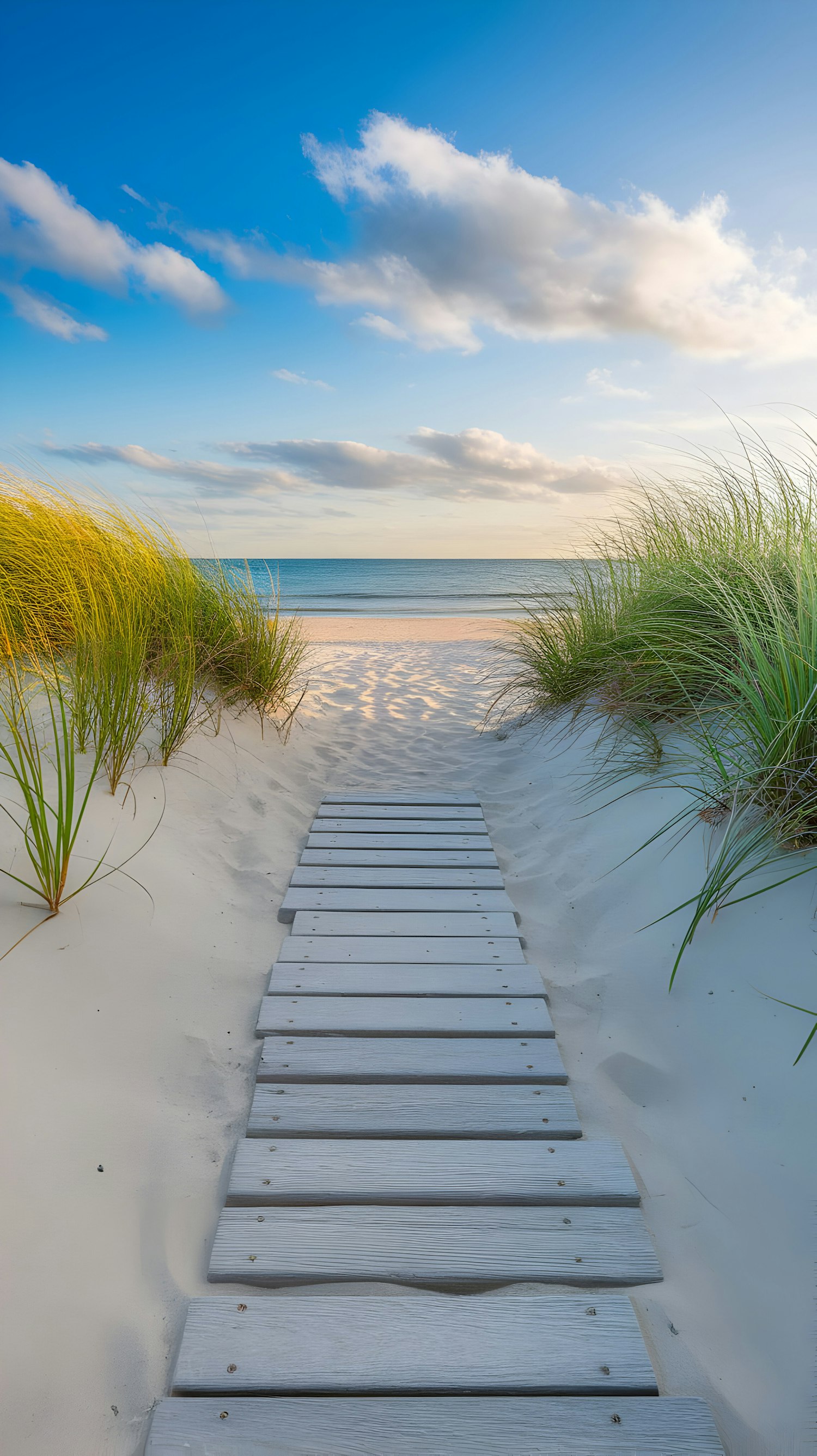 Wooden boardwalk through sand dunes leads to a calm beach with blue skies, fluffy clouds, and gentle ocean waves.