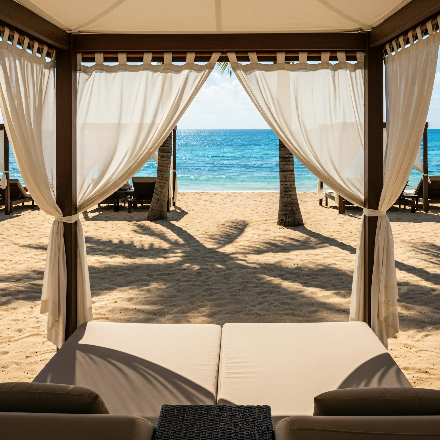 Relax in a luxurious beach cabana with stunning ocean views, soft sand, and swaying palm trees under a clear blue sky.