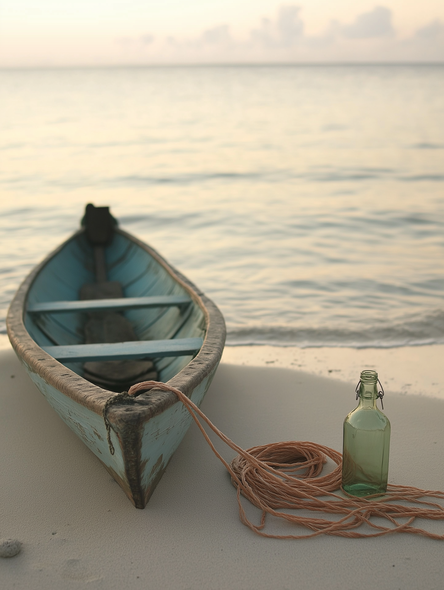 A rustic blue canoe on a sandy beach with a coiled rope and green glass bottle, set against a calm sea and soft pastel sky.