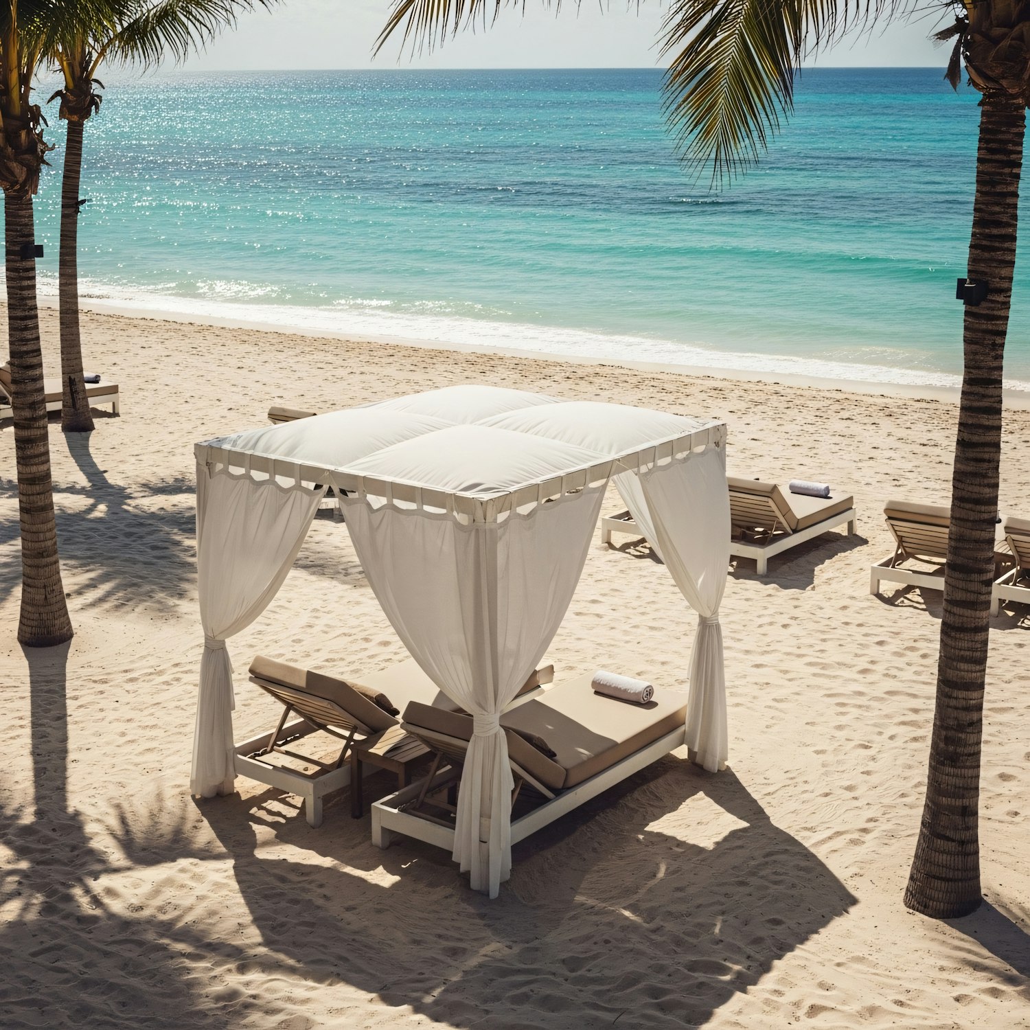 Relaxing beachside canopy with white curtains, surrounded by palm trees and overlooking turquoise waters. Perfect tropical getaway.