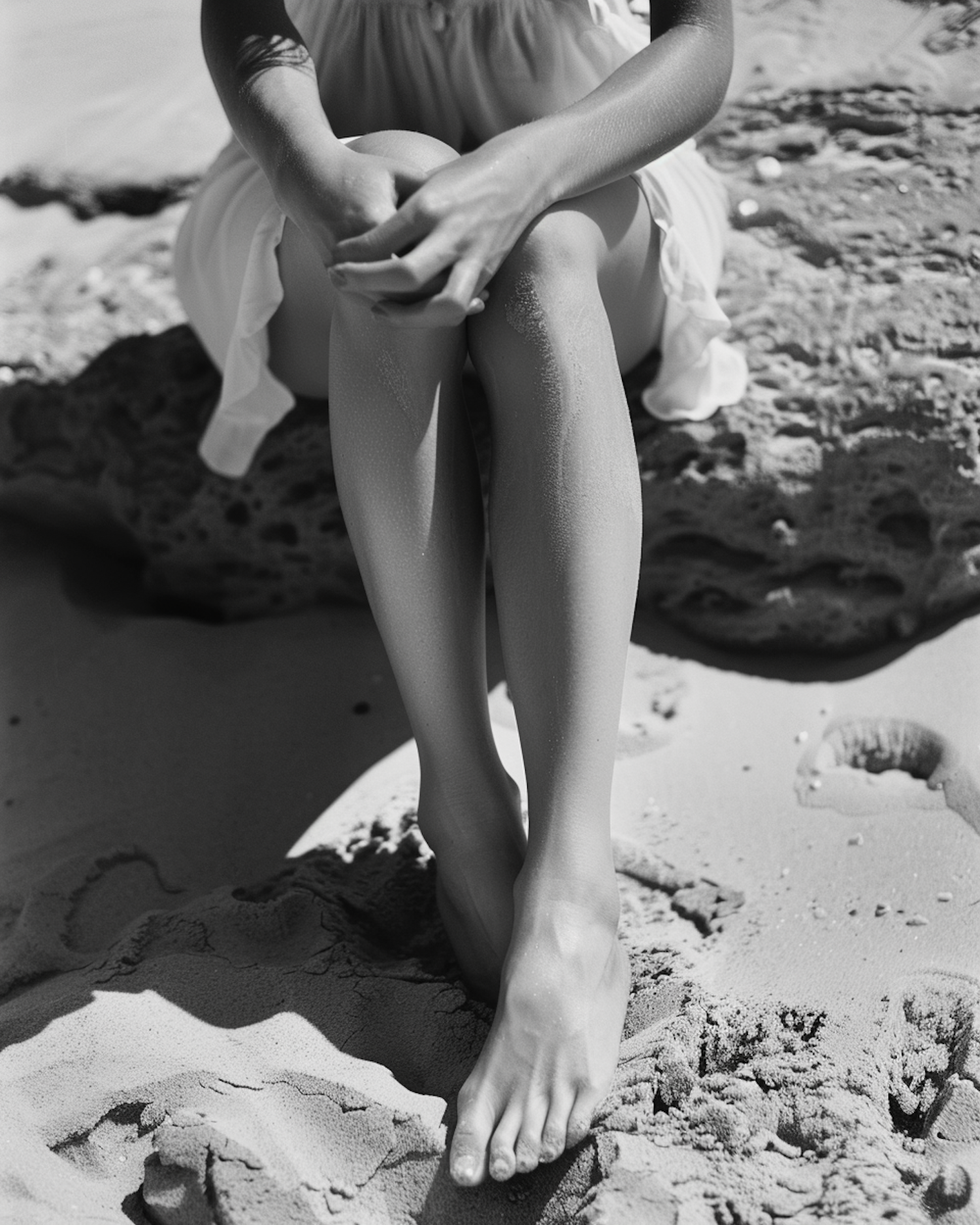 Black and white photo of a person sitting on a rock at the beach, focusing on crossed legs and bare feet in the sand.
