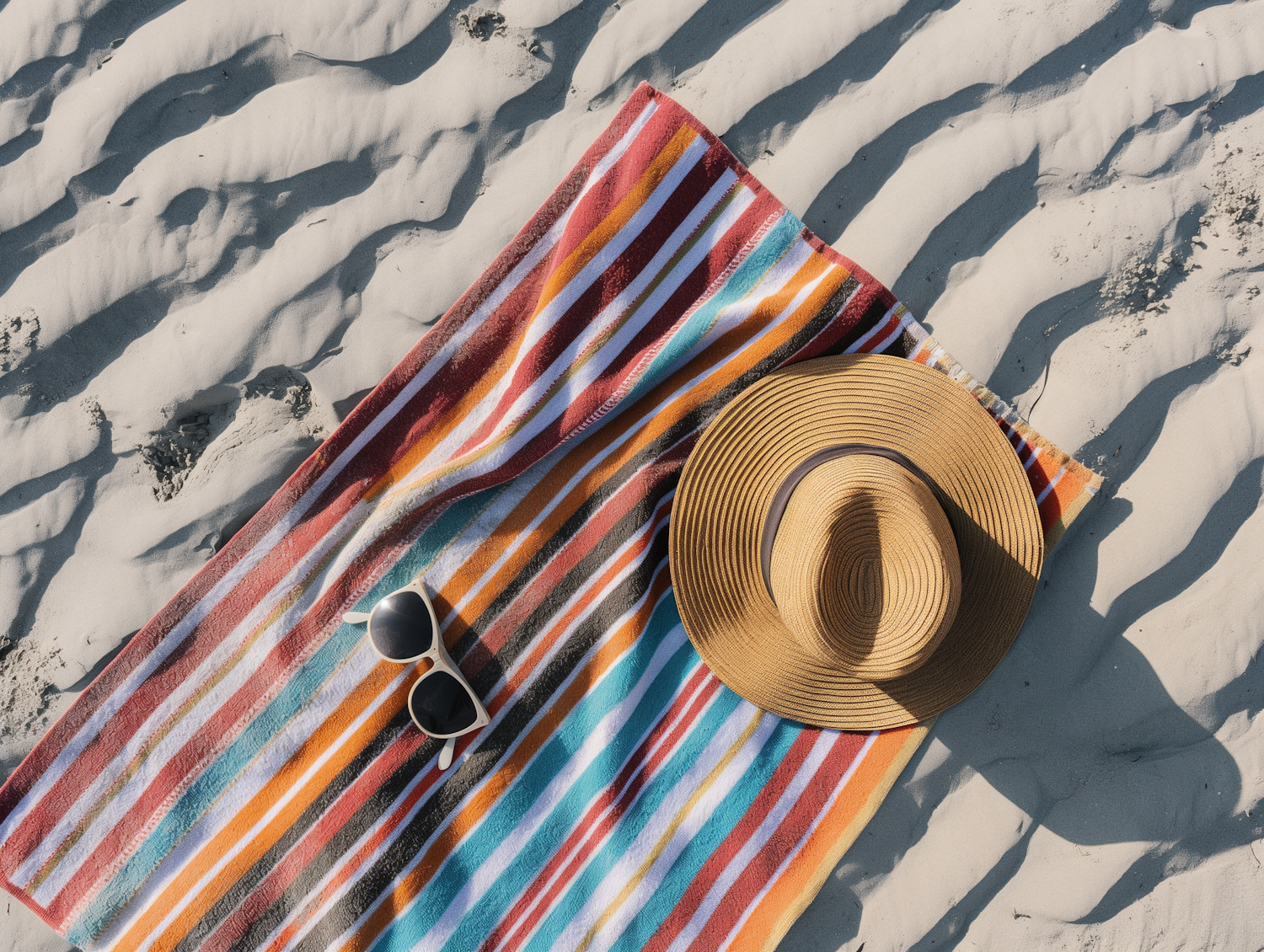 Colorful beach towel with straw hat and sunglasses on rippled sand, evoking summer relaxation and style.