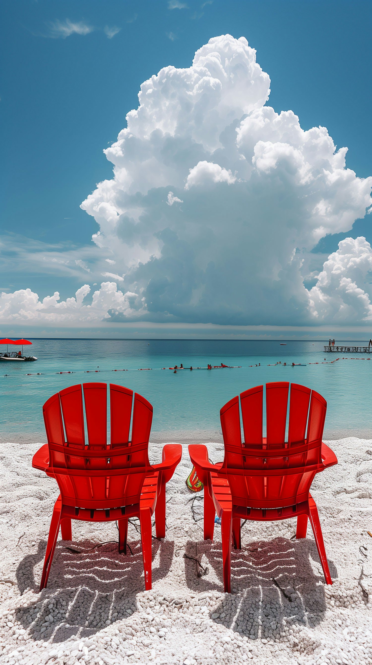 Two red chairs on a pebble beach face a turquoise sea under a dramatic cloud-filled sky, creating a vibrant coastal scene.