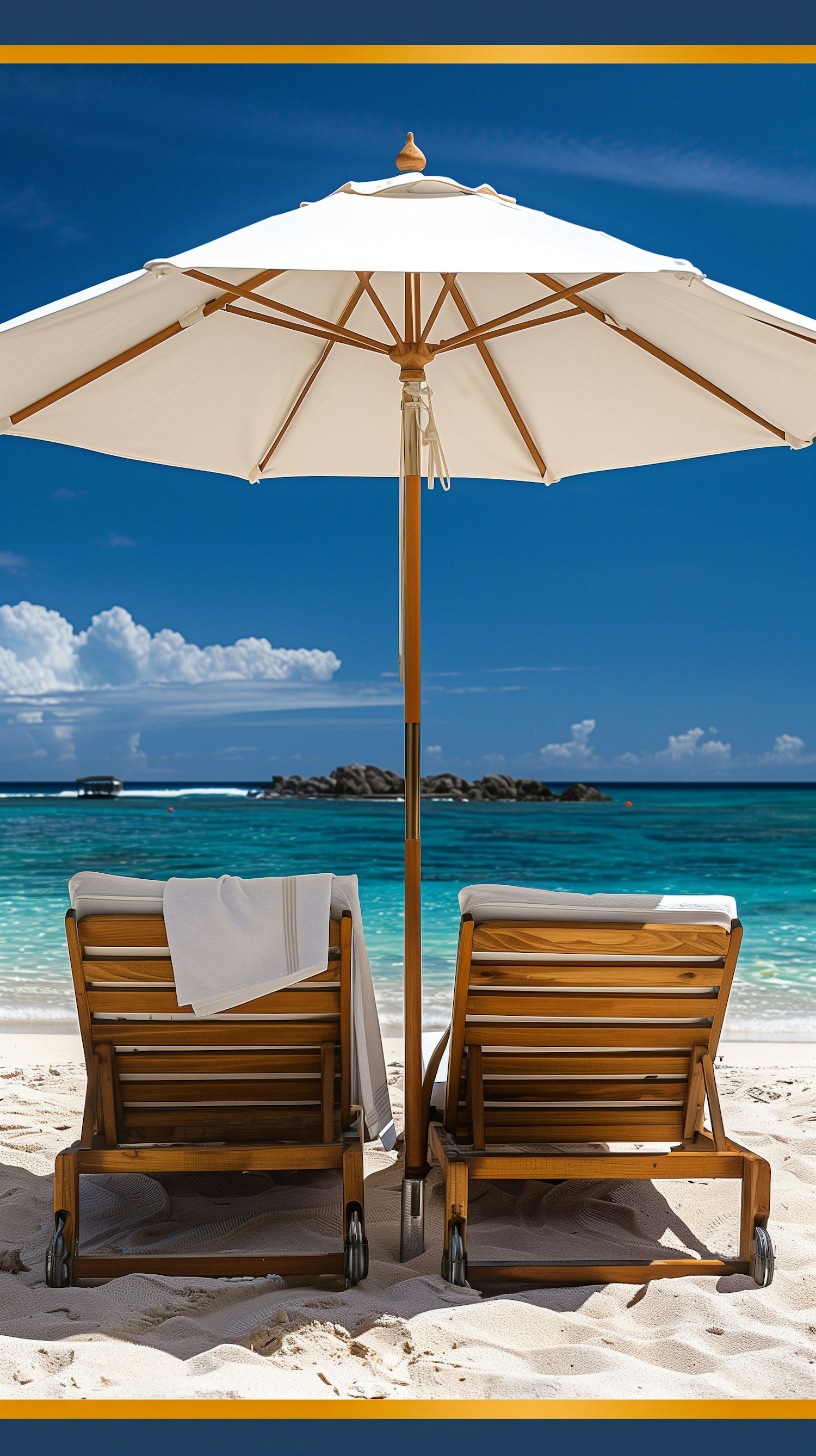 Relaxing beach scene with two wooden lounge chairs under a white umbrella, facing a turquoise sea and blue sky.