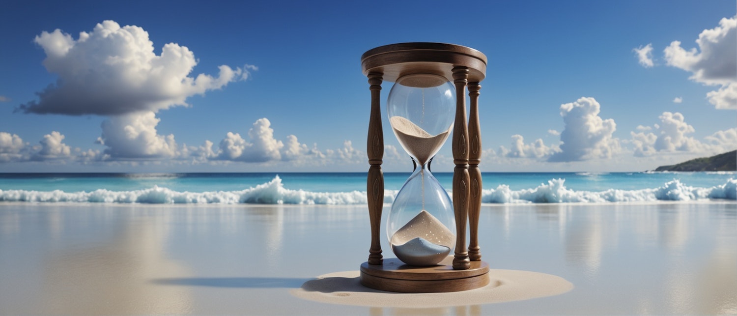 A wooden hourglass on a serene beach with rolling waves and a vibrant blue sky dotted with clouds. A perfect blend of nature and symbolism.