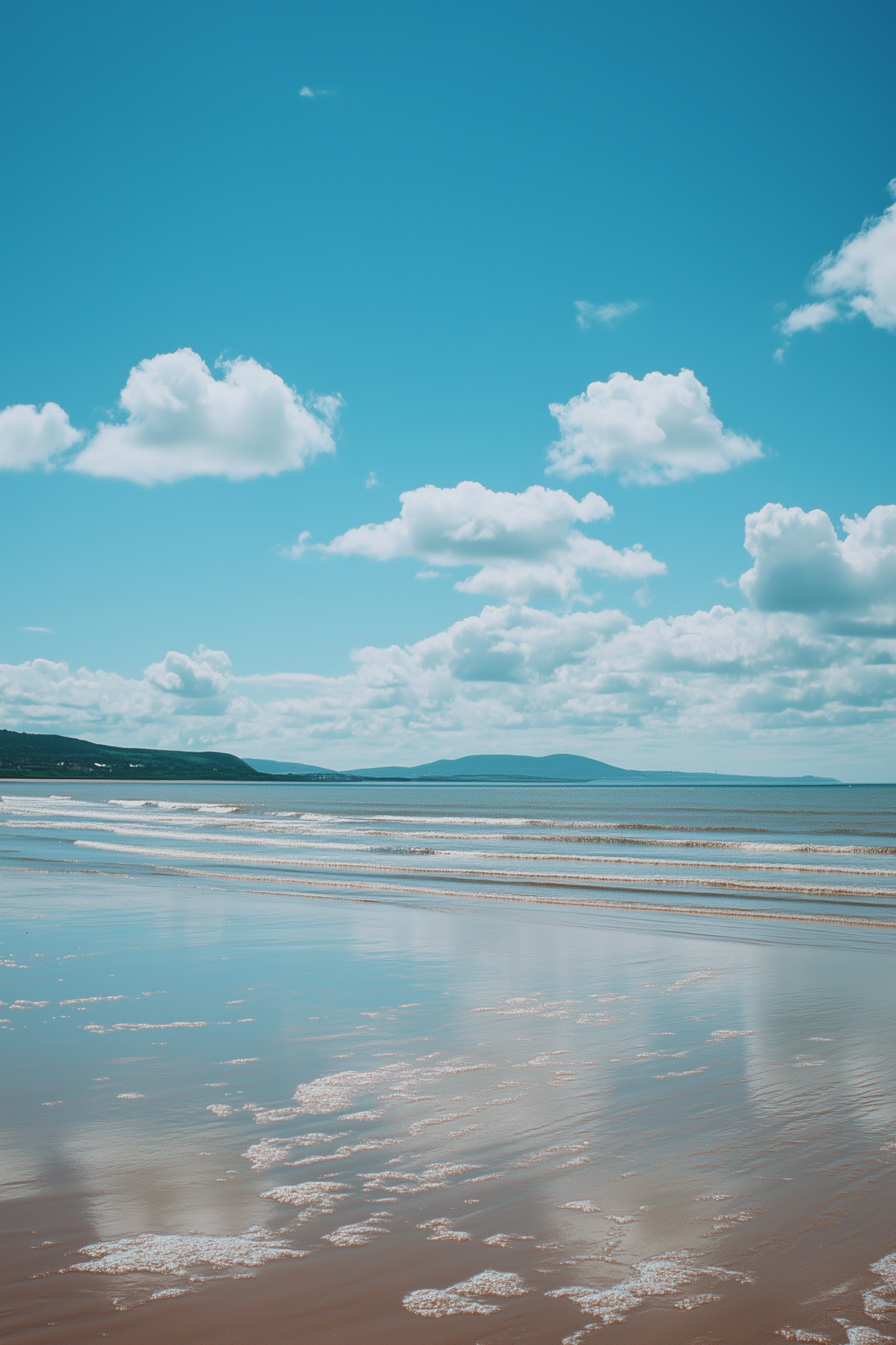 A tranquil beach with wet sand reflecting a blue sky and clouds, gentle waves, and distant hills on the horizon.
