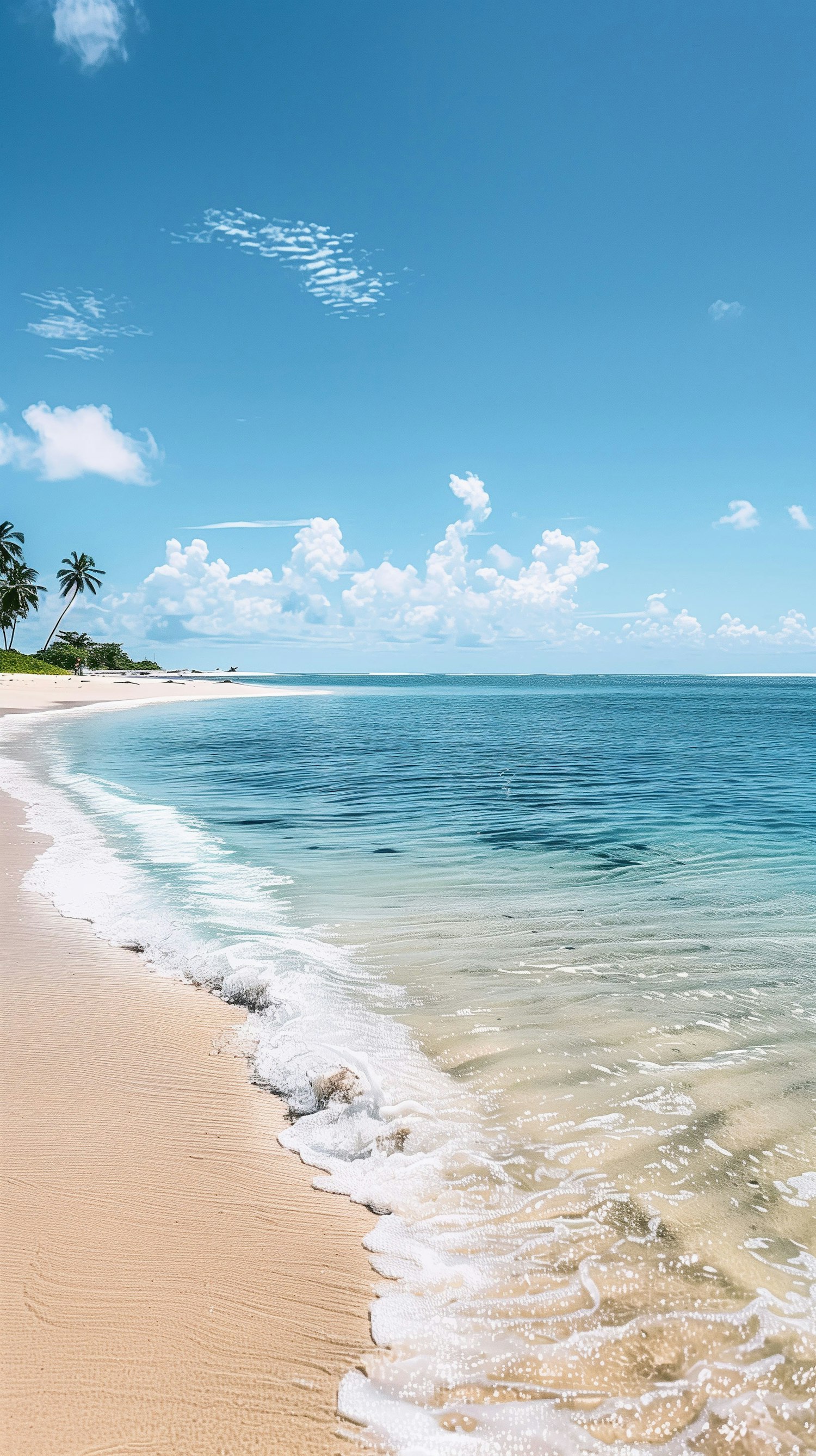 Tranquil beach with golden sand, gentle waves, and palm trees under a bright blue sky with fluffy clouds.