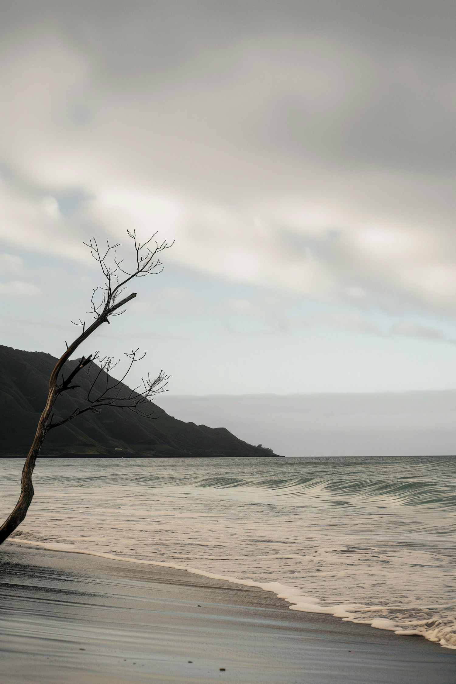 Serene beach with a lone tree, gentle waves, and a lush hillside under an overcast sky, creating a tranquil atmosphere.