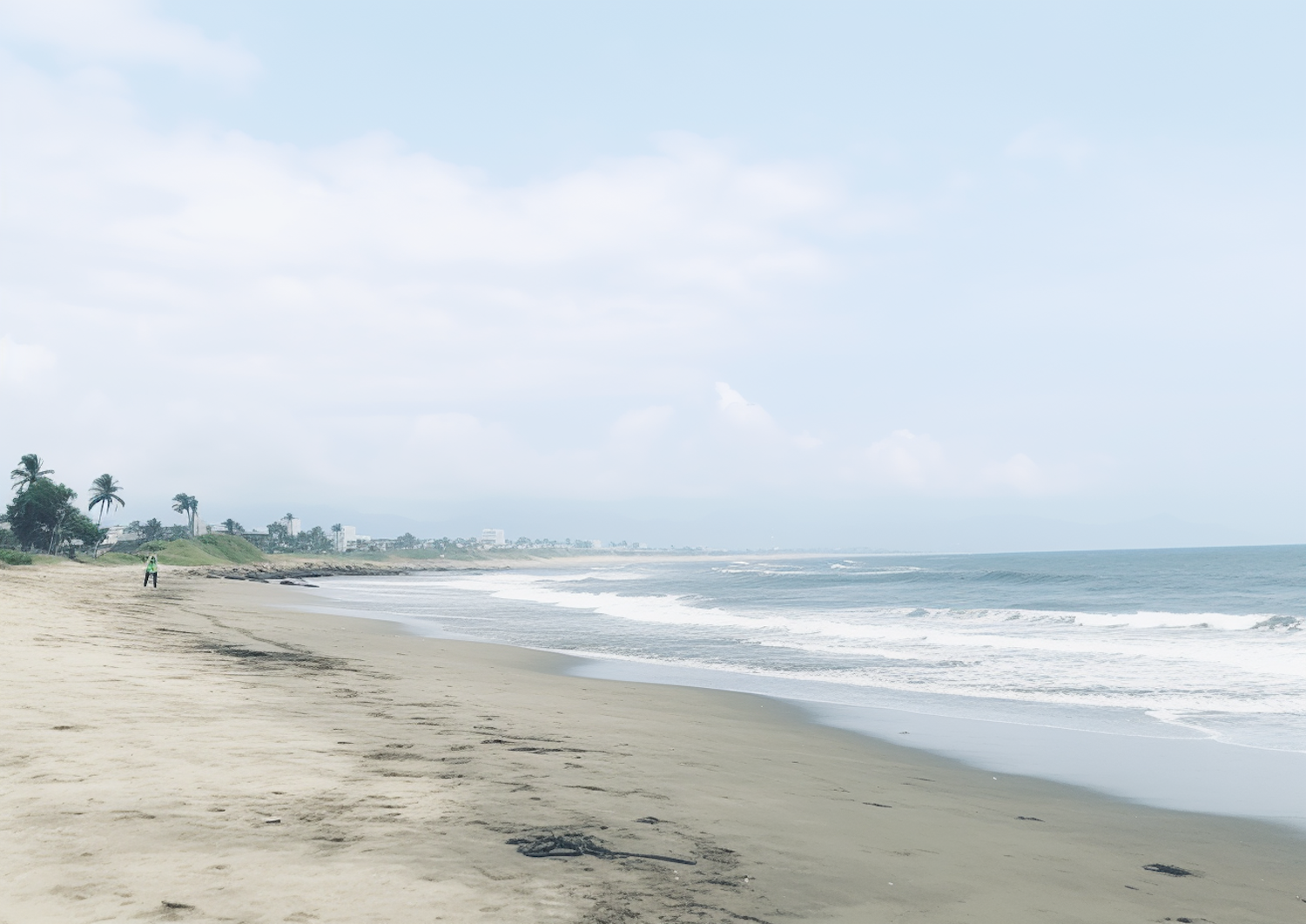 Tranquil beach scene with gentle waves, palm trees, and a lone walker in a green jacket under a pale blue sky.