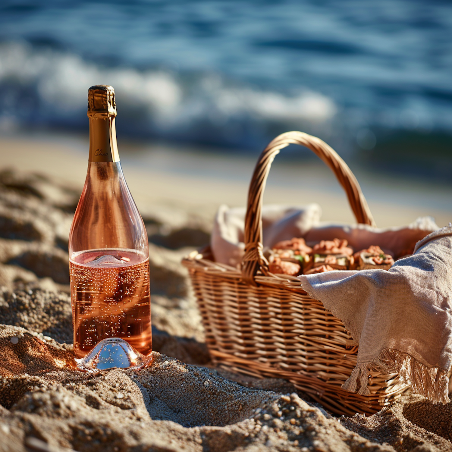 Beach picnic with rosé wine and wicker basket by the ocean, creating a serene and inviting atmosphere.