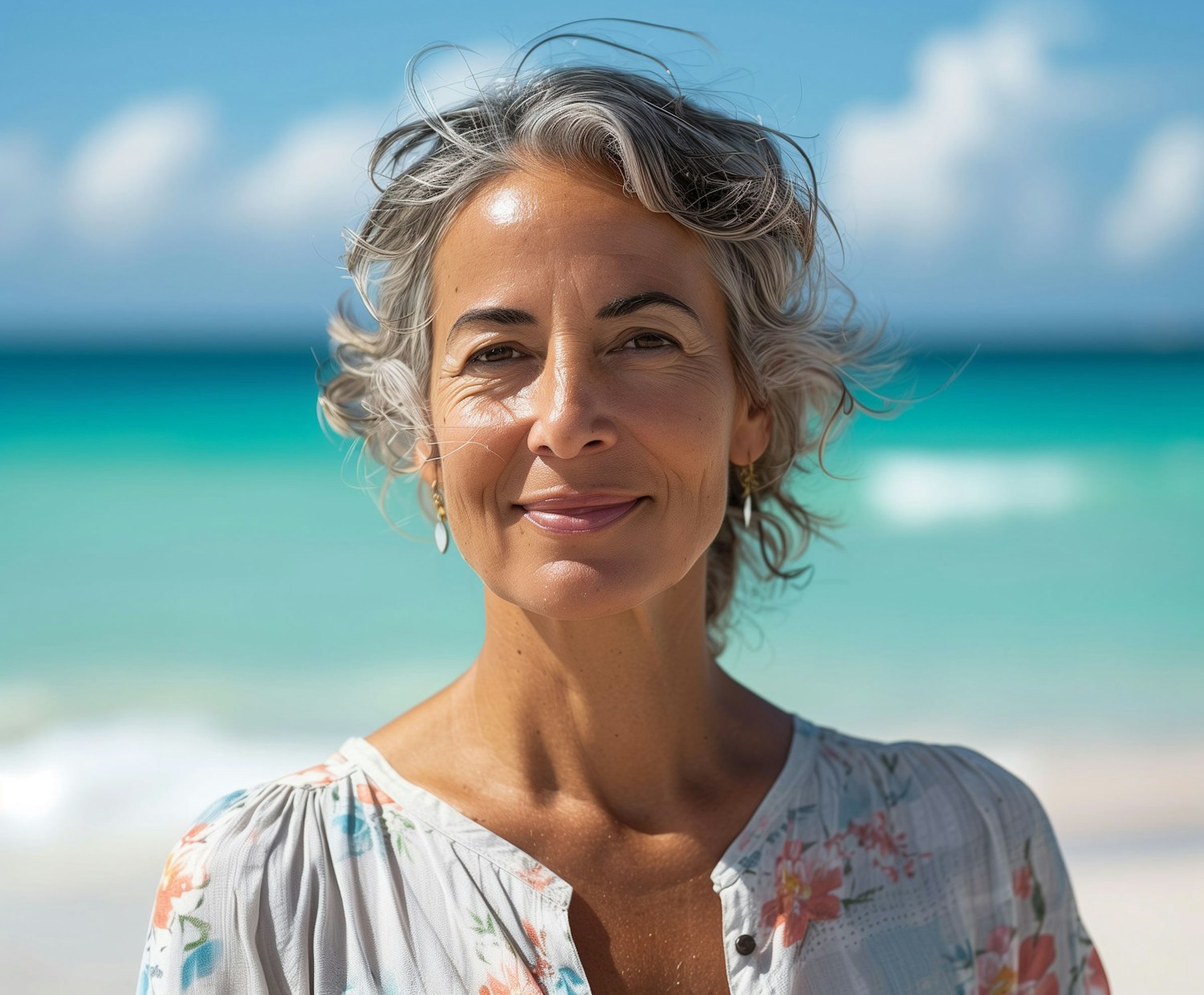 Serene middle-aged woman with gray hair and floral blouse on a sunny beach, with turquoise ocean and blue sky in the background.