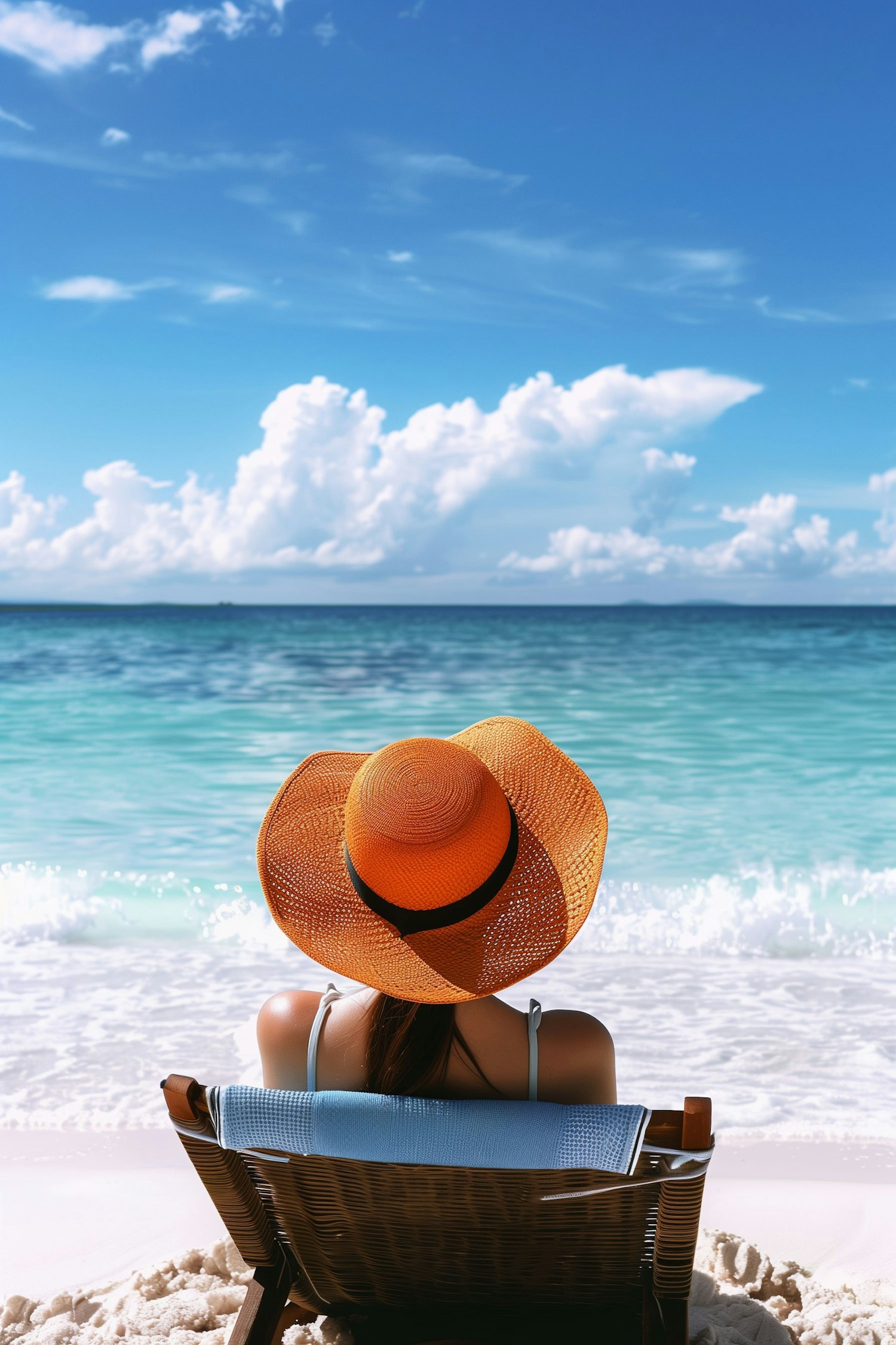 Woman in orange sun hat relaxing on a beach chair by turquoise ocean under a clear blue sky.