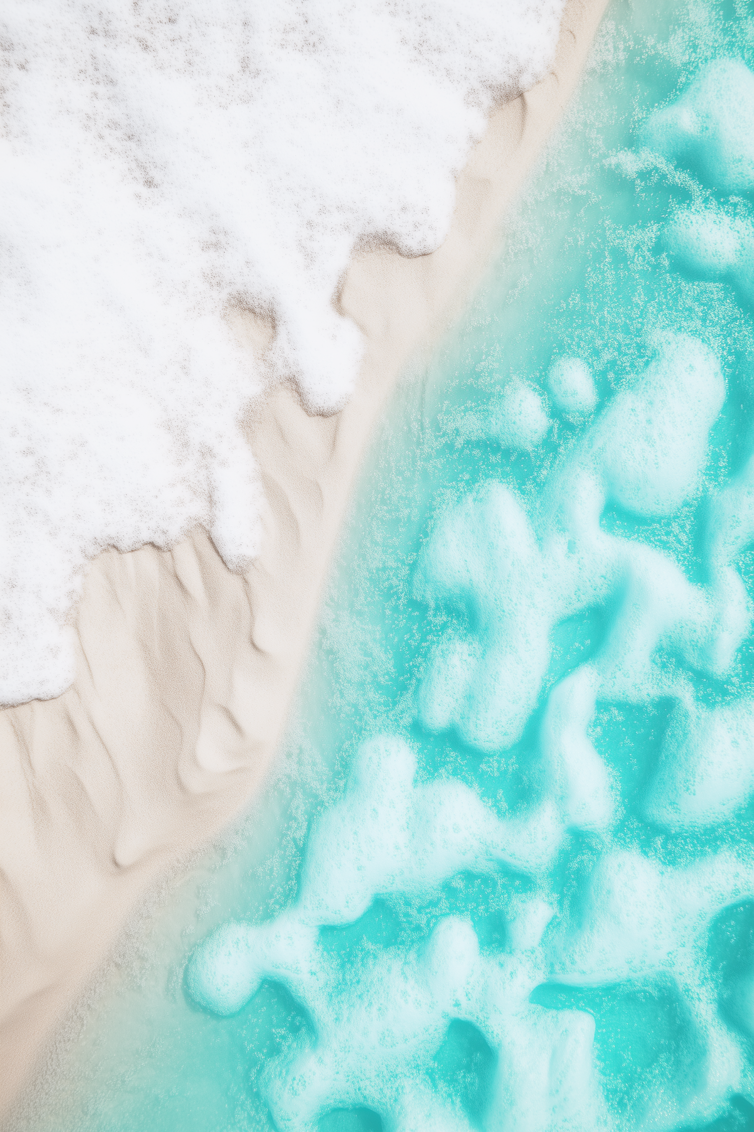 Aerial view of a beach with beige sand and turquoise water, featuring frothy white waves gently lapping the shore.