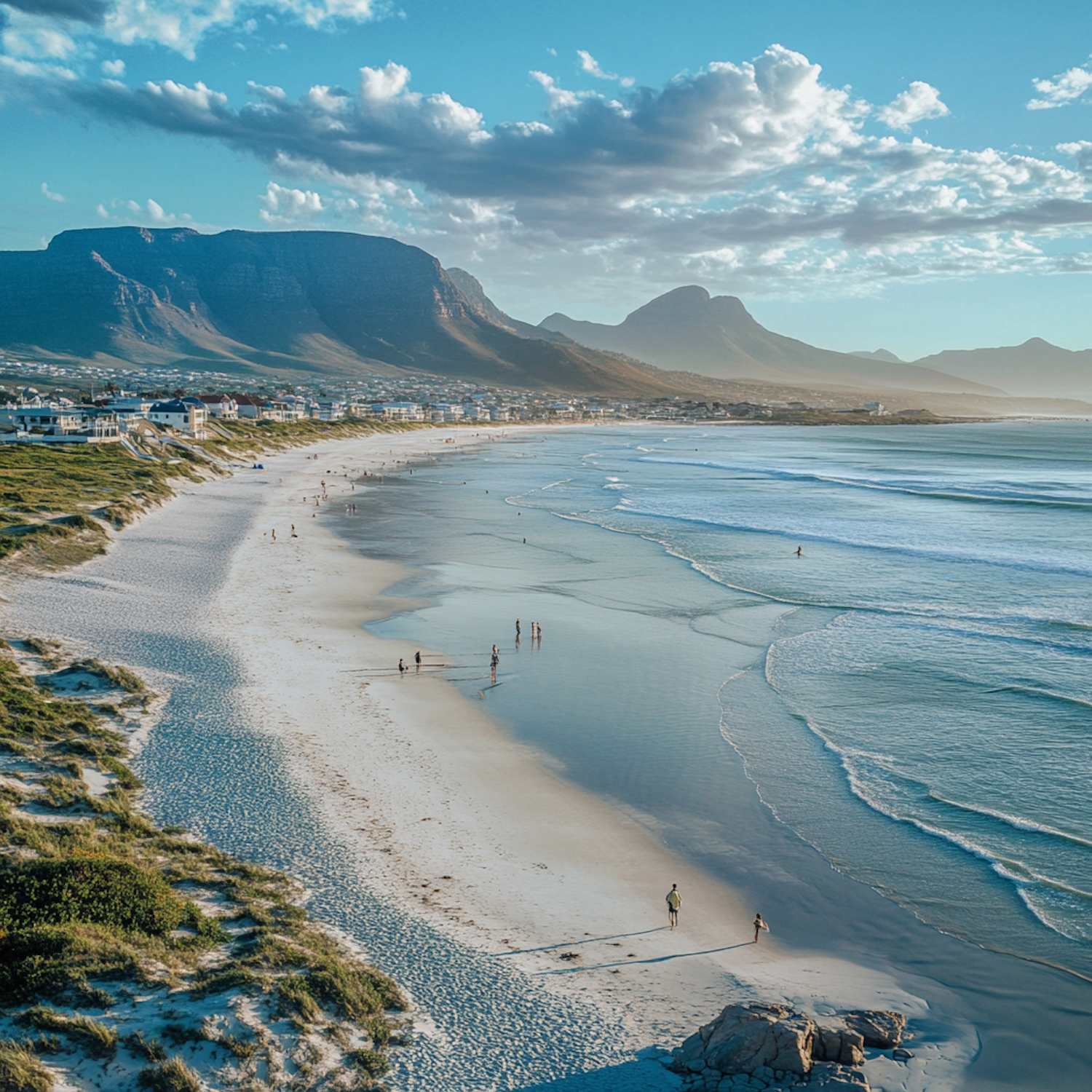 Scenic beach with gentle waves, people enjoying the sun, and majestic mountains in the background under a vibrant blue sky.