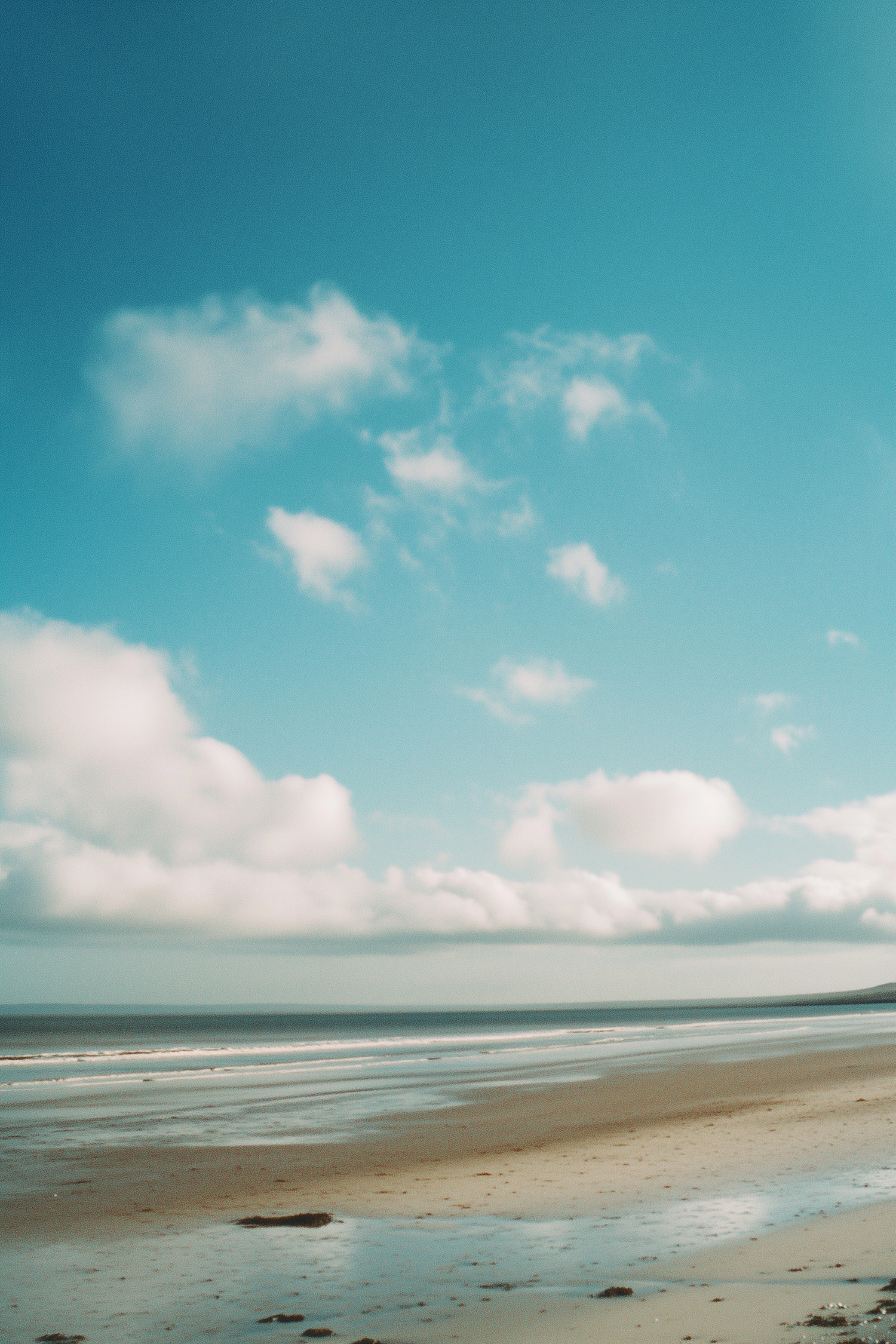 A tranquil beach with wet sand reflecting a blue sky and fluffy clouds, calm waves, and a serene horizon in the distance.