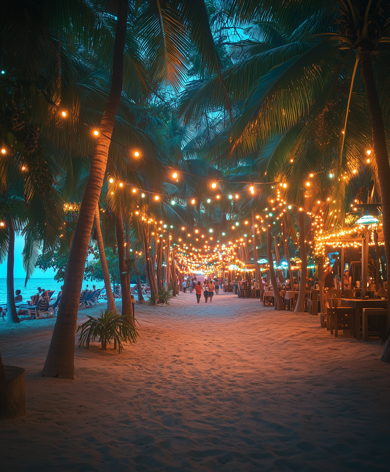 Enchanting beach path at dusk with glowing lights, palm trees, and a cozy dining area by the ocean.