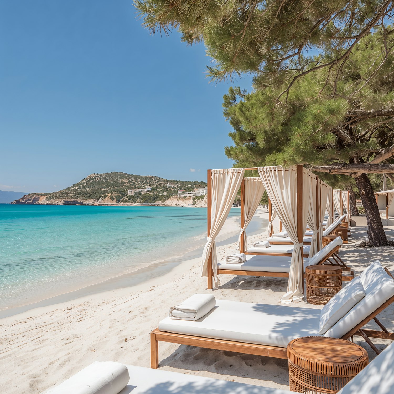 Relaxing beach with turquoise waters, white sand, and elegant cabanas under lush trees, perfect for a tranquil getaway.