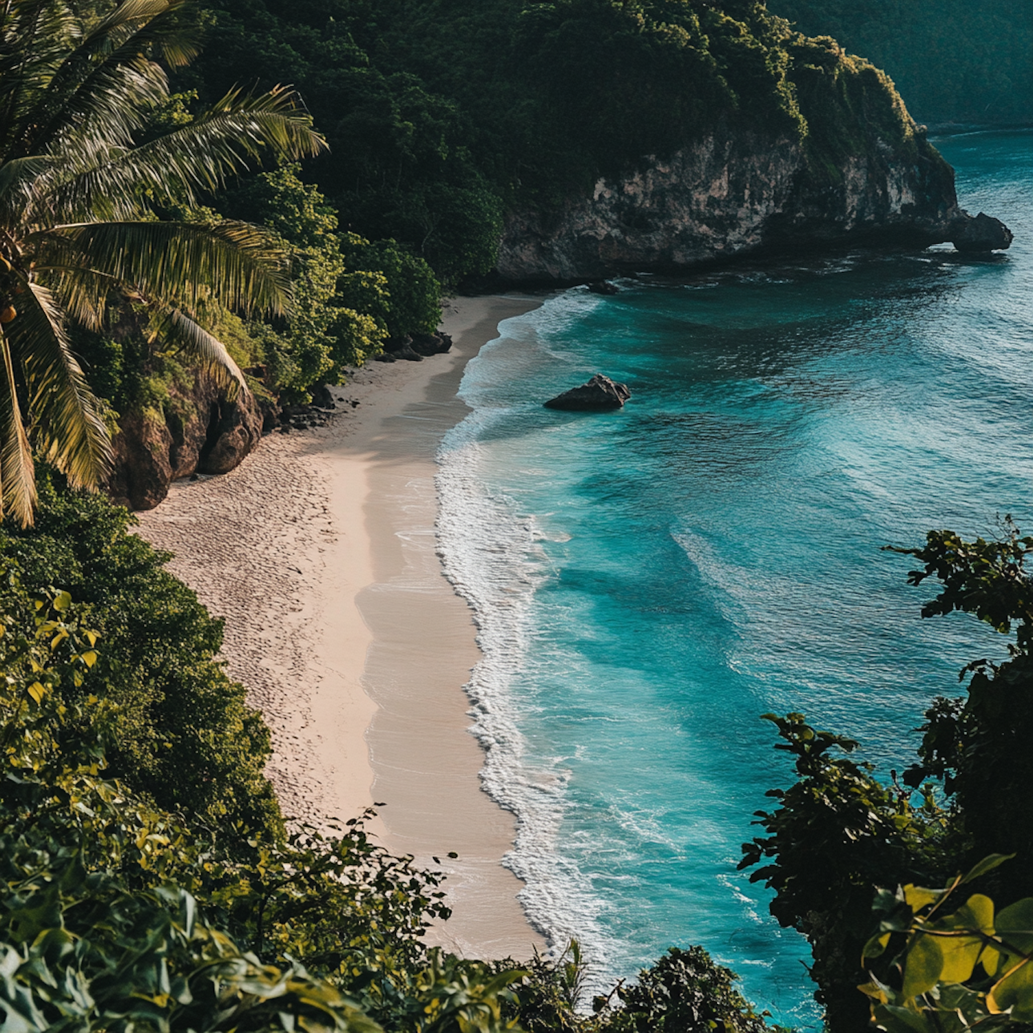Pristine beach with turquoise waves, white sand, and lush greenery. A tropical paradise perfect for relaxation and escape.