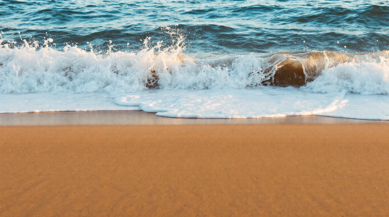 Golden sand meets foamy waves under a warm sun, creating a tranquil beach scene with rich blue water and dynamic contrasts.