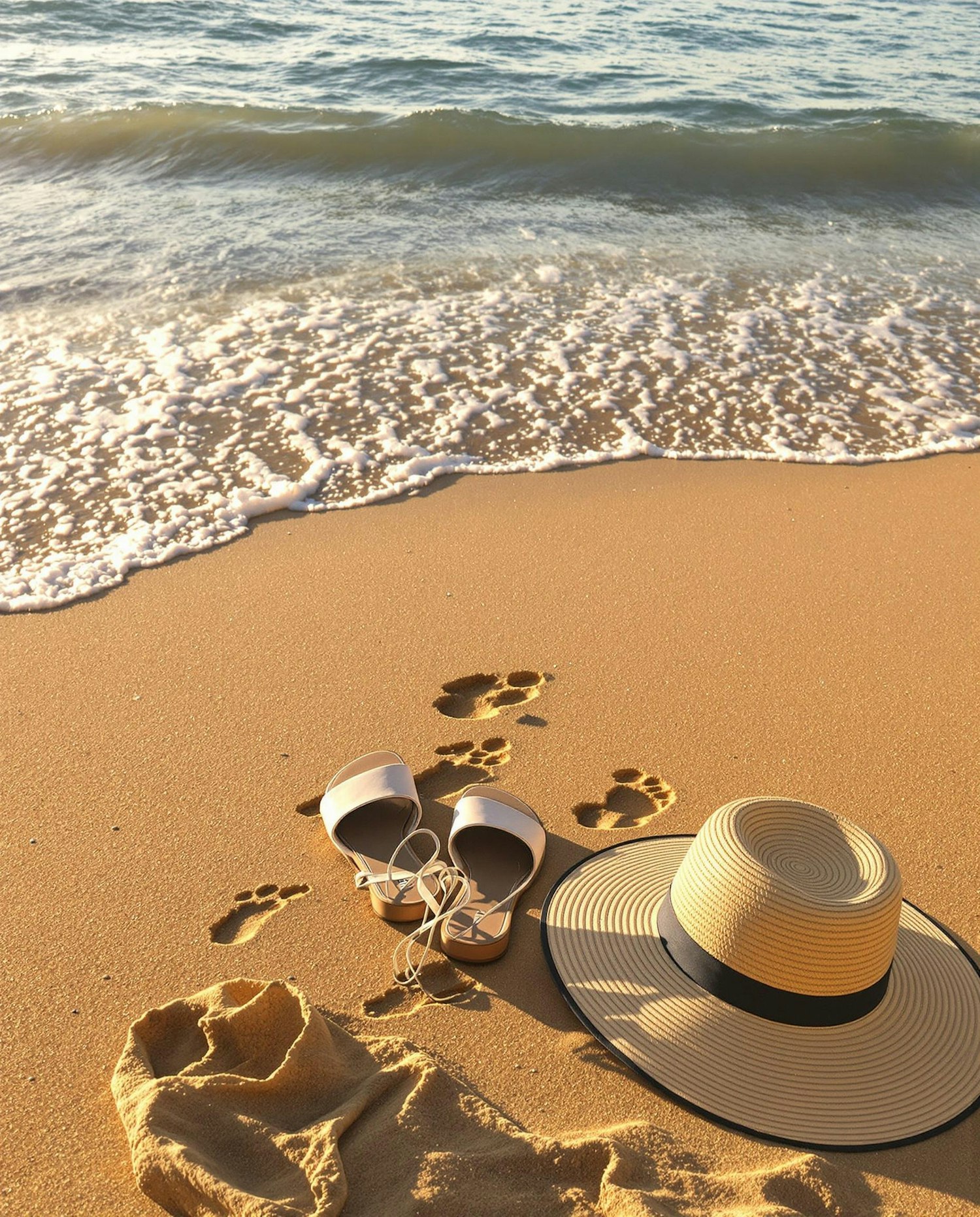 A serene beach scene with sandals, a straw hat, and footprints on golden sand, framed by gentle waves and warm sunlight.