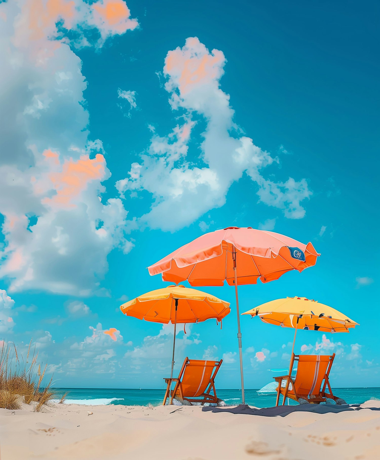 Vibrant beach scene with orange and yellow umbrellas, wooden chairs, and a bright blue sky. Perfect for a relaxing seaside day.