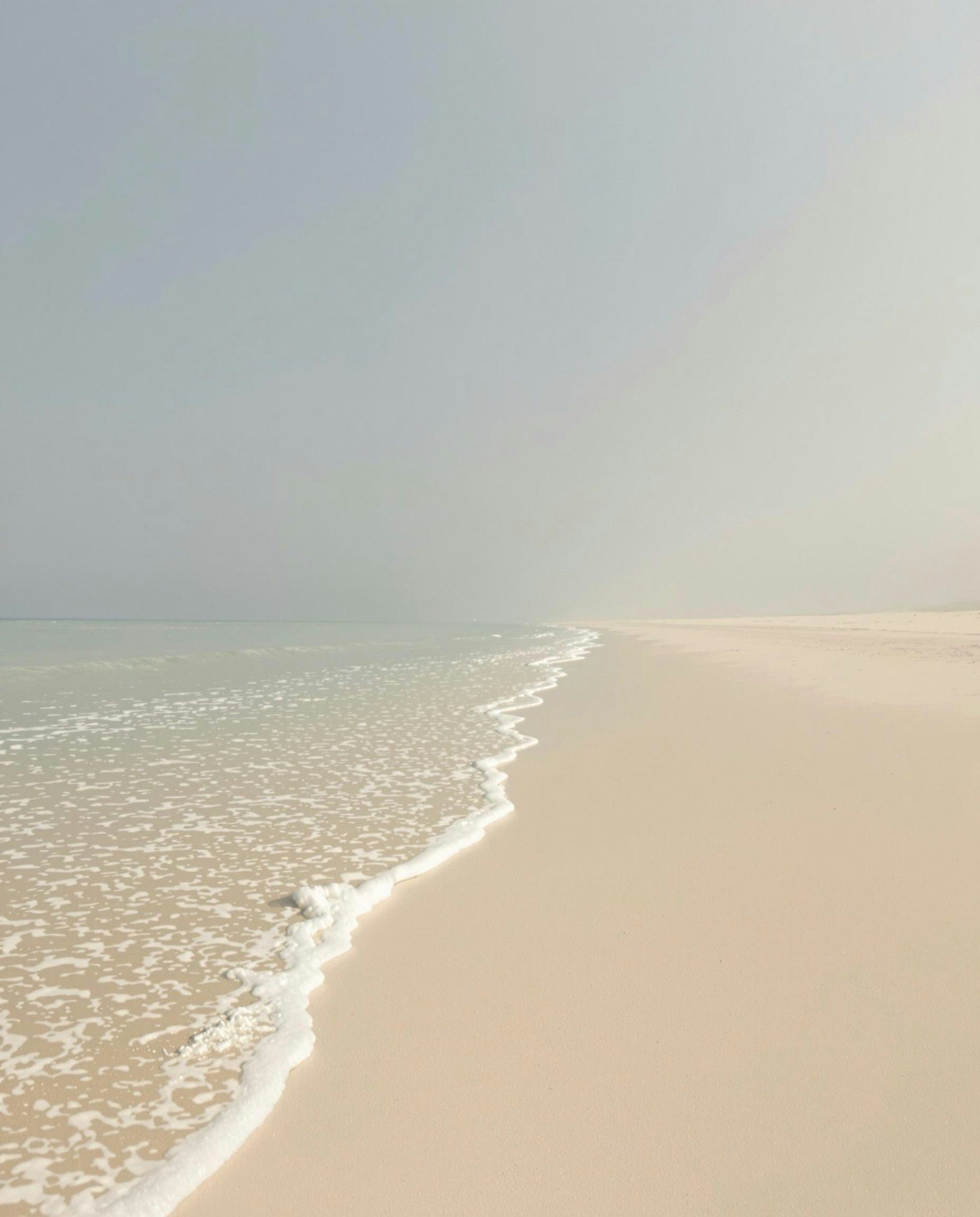 A tranquil beach with soft sand and gentle waves under a hazy blue sky, perfect for a serene and minimalist coastal vibe.