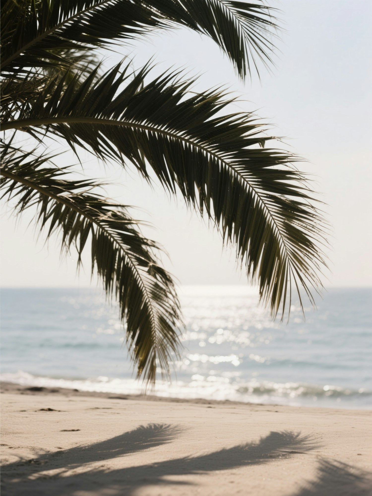 A tranquil beach scene with palm fronds casting shadows on the sand and the ocean sparkling under the sunlight.