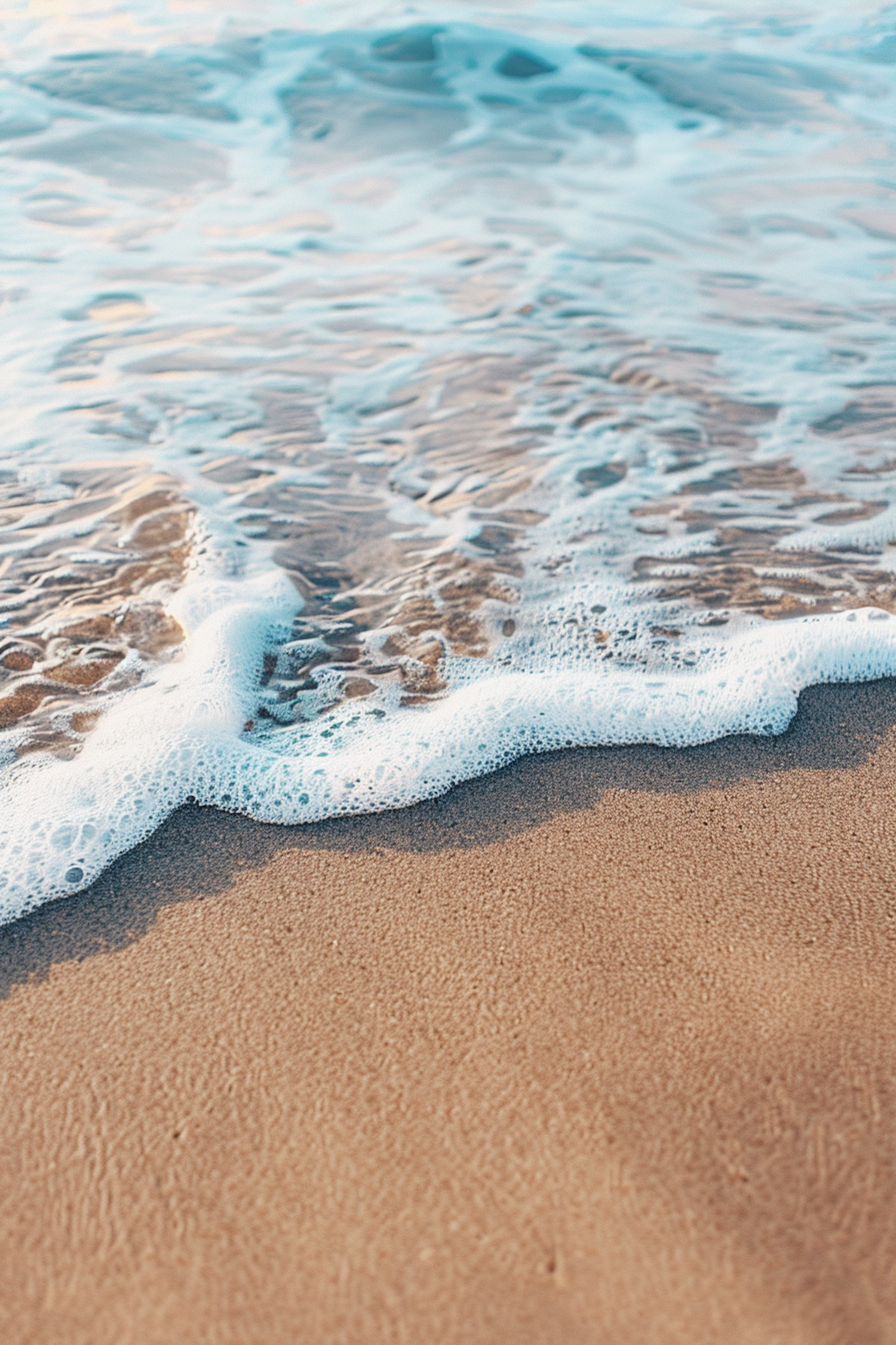 Serene ocean waves meeting a golden sandy beach, with vibrant blue water and white foam under soft sunlight.