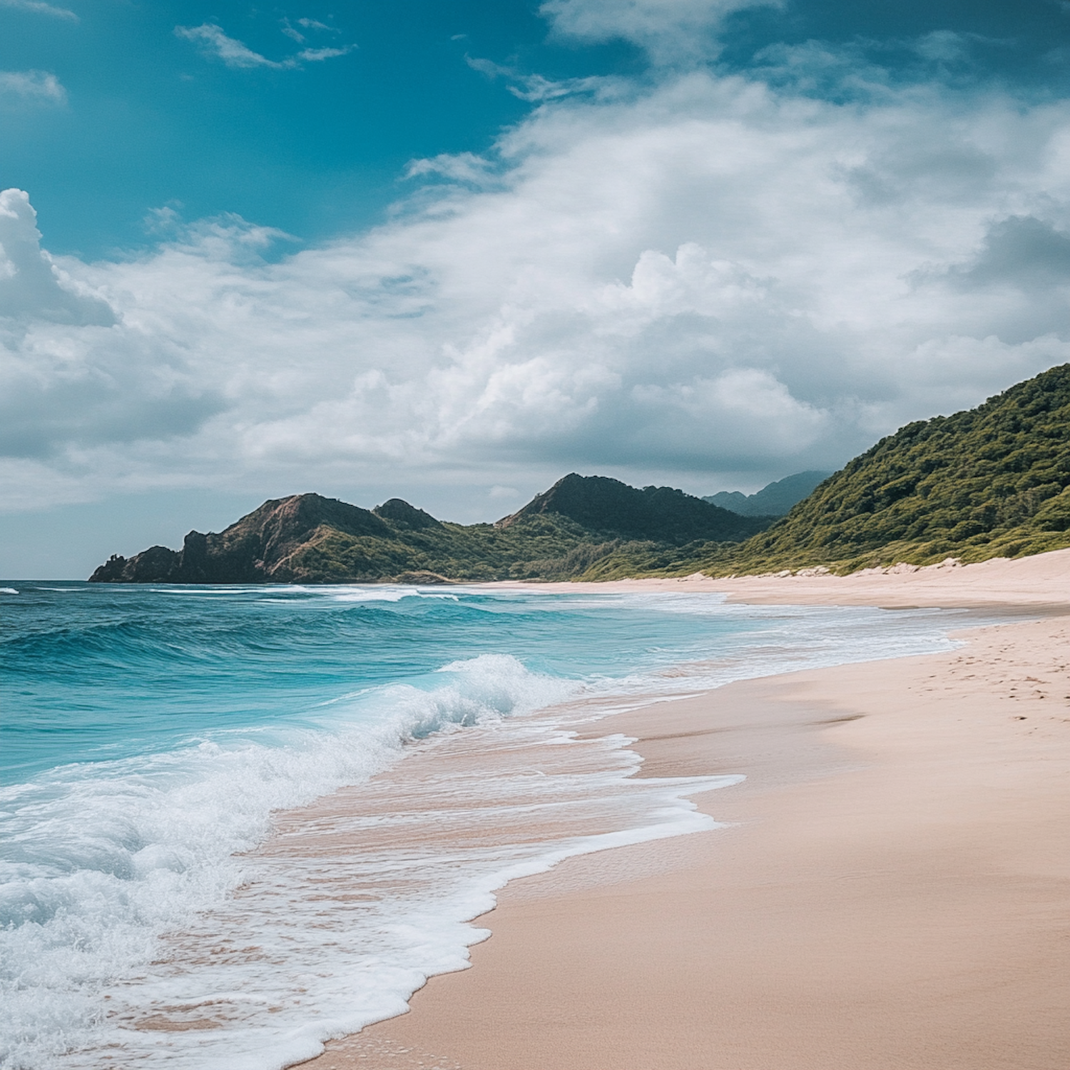 Tranquil beach with turquoise waves, golden sand, and lush green hills under a vibrant blue sky with fluffy clouds.