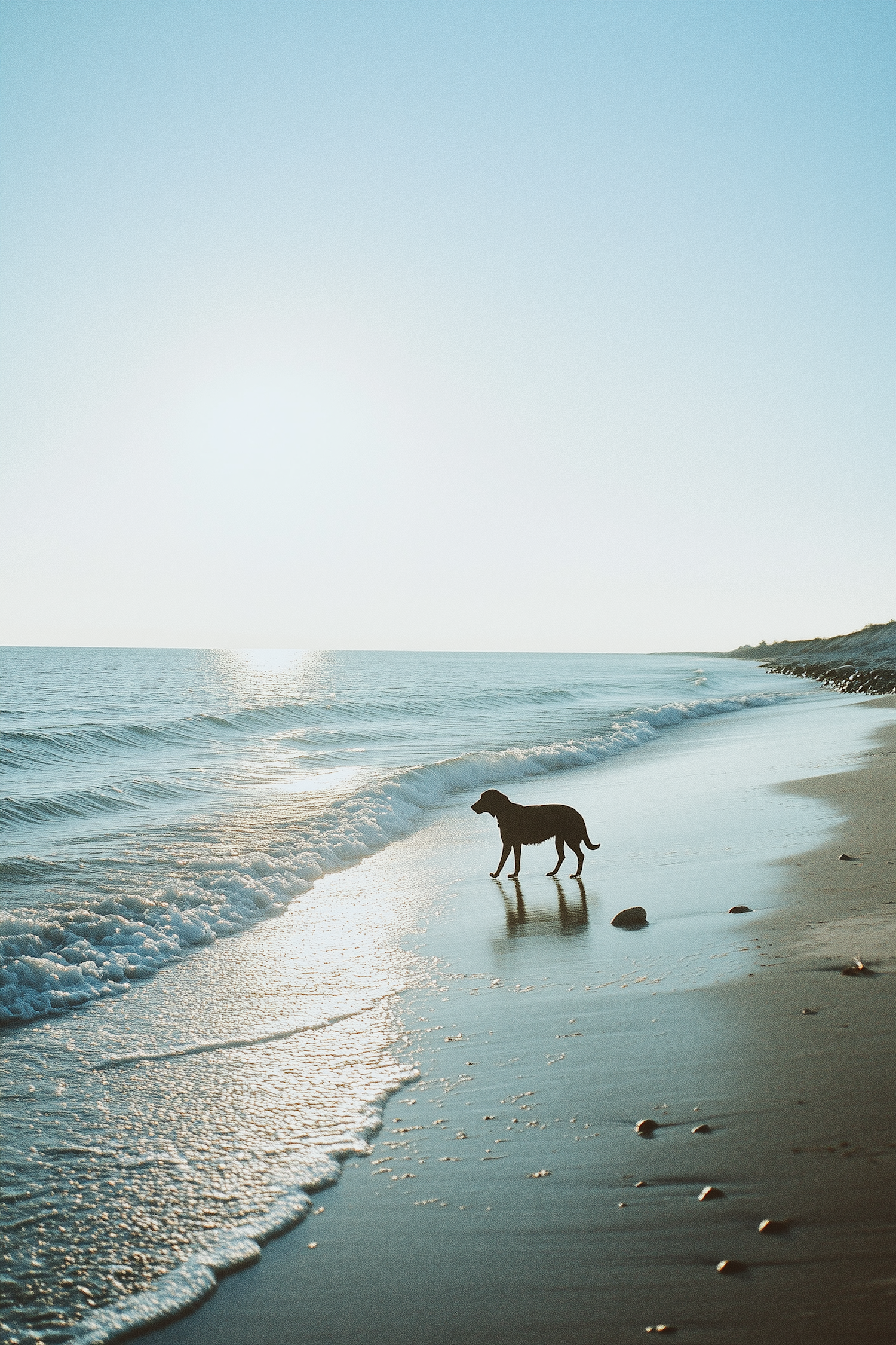 A dog stands at the water's edge on a tranquil beach, with gentle waves and a golden sunset creating a serene atmosphere.
