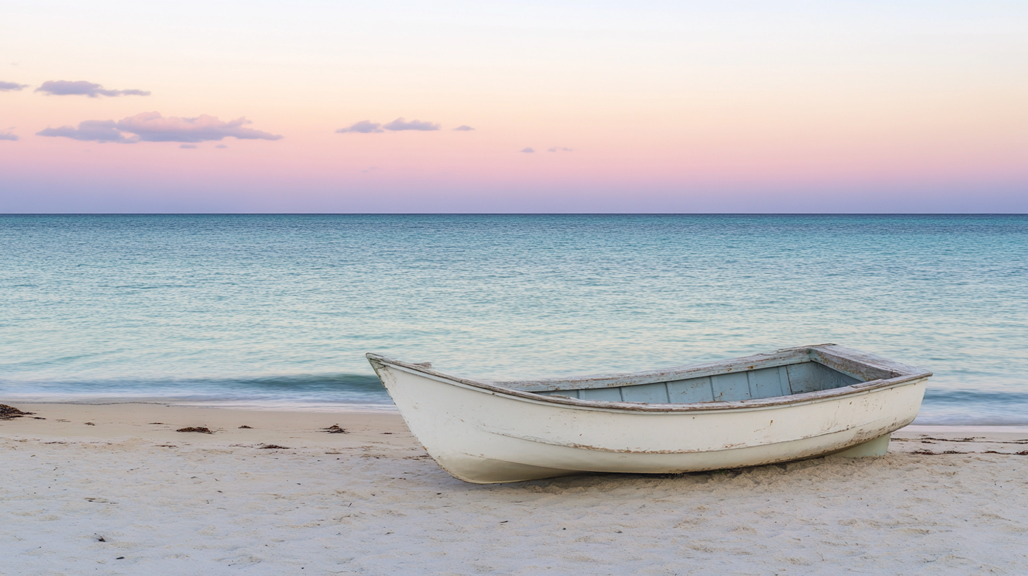 A weathered white rowboat on a tranquil beach with pastel skies and calm turquoise waters.