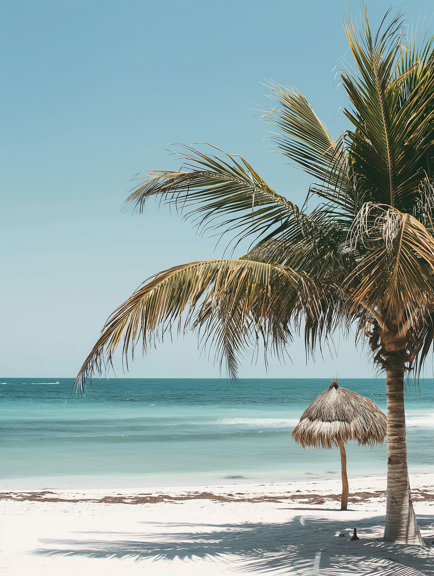 Tranquil beach scene with palm tree, thatched umbrella, and turquoise ocean under a clear blue sky.