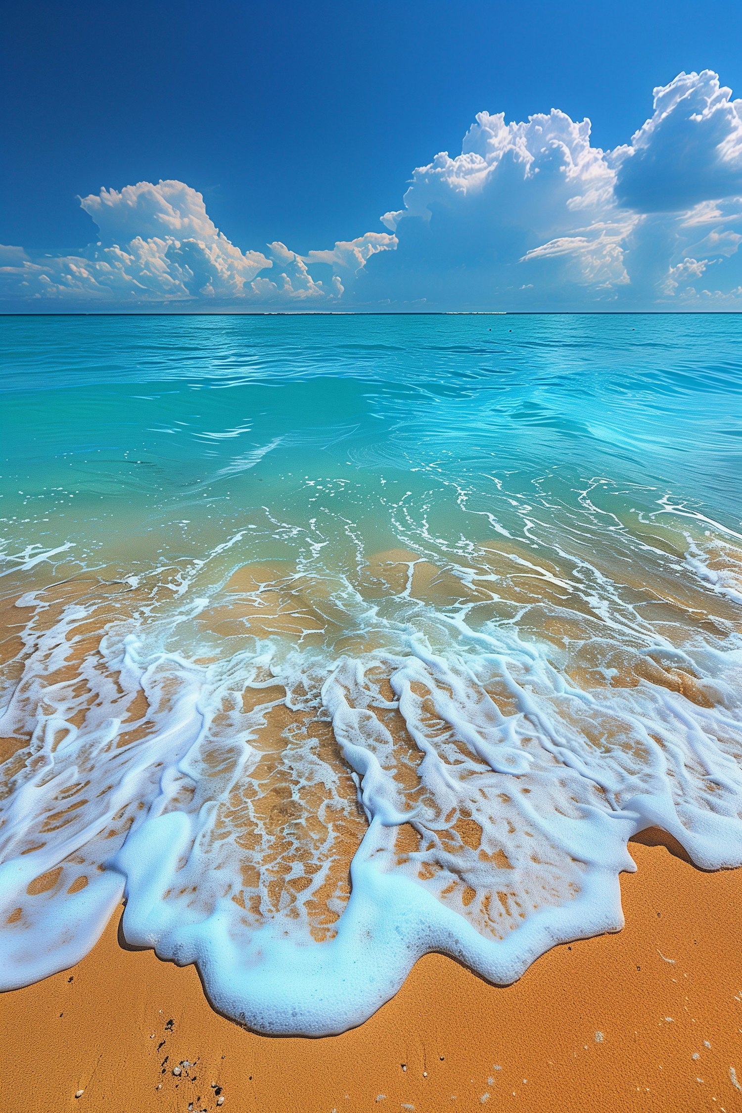 Serene beach scene with golden sand, turquoise waves, and a bright blue sky with fluffy clouds. Perfect for a tranquil escape.