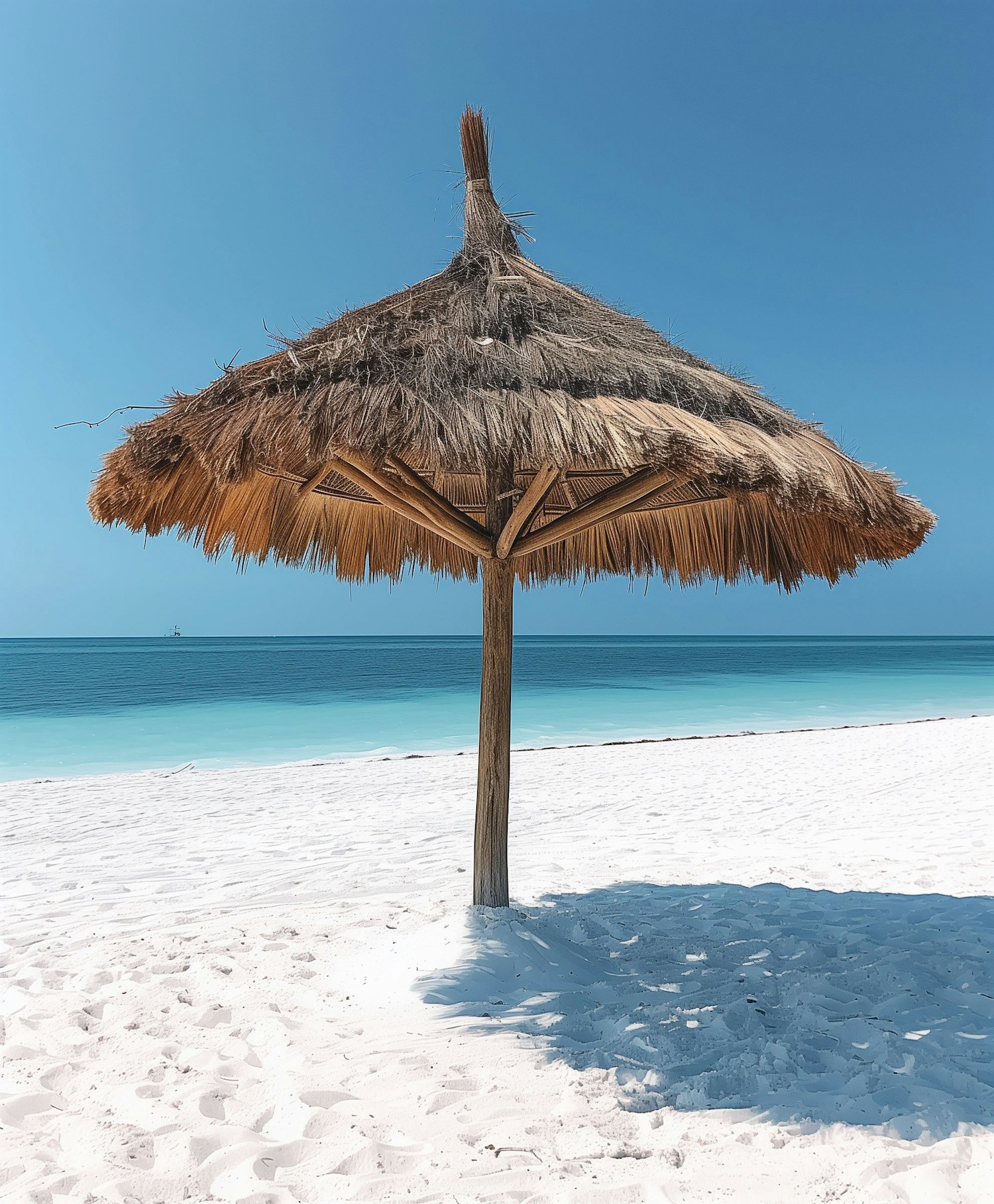 A tranquil beach with a thatched umbrella on white sand, turquoise sea, and a clear blue sky. Perfect for a tropical getaway.