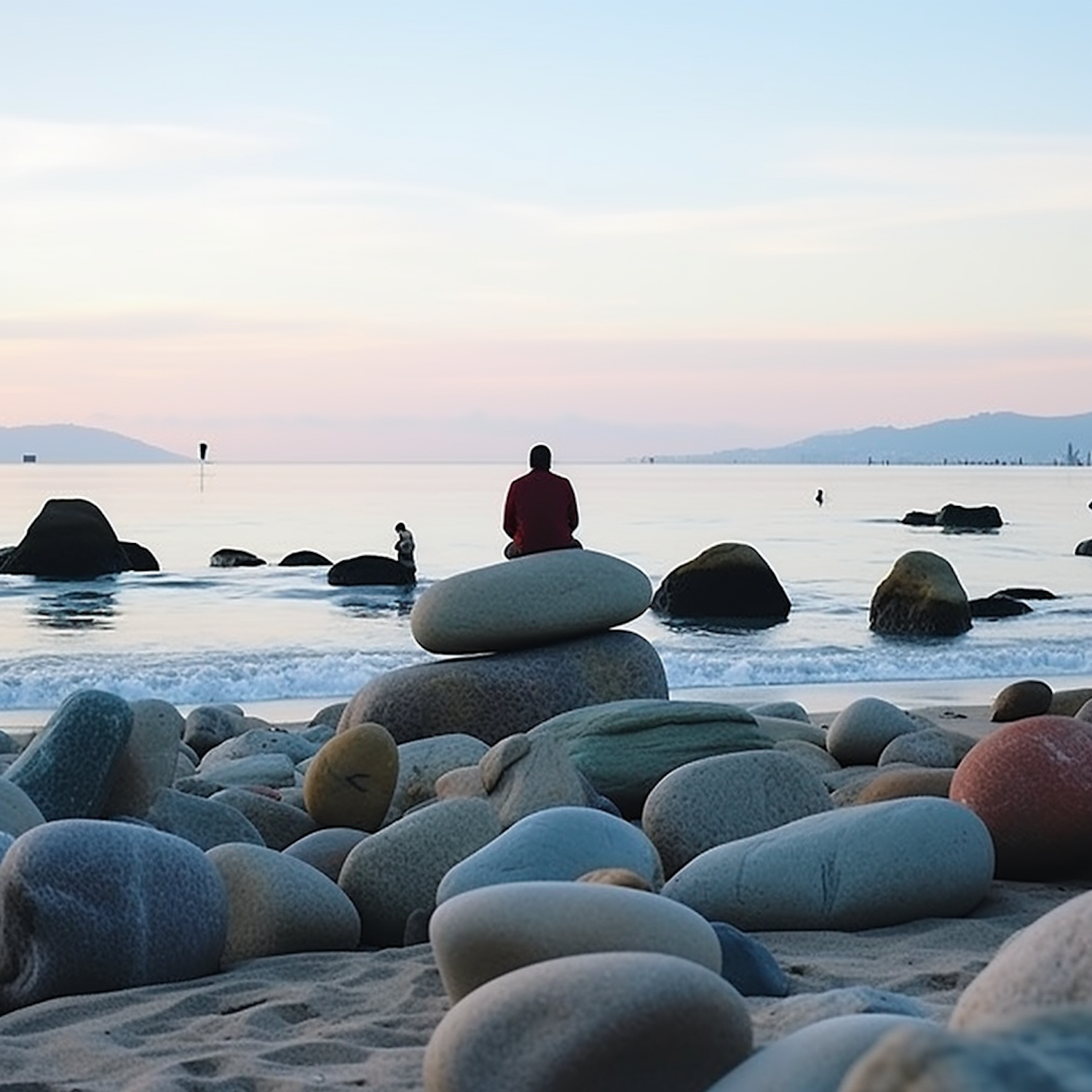 Serene beach scene with smooth stones, a person in red sitting by the calm sea, and a pastel sky at sunrise or sunset.