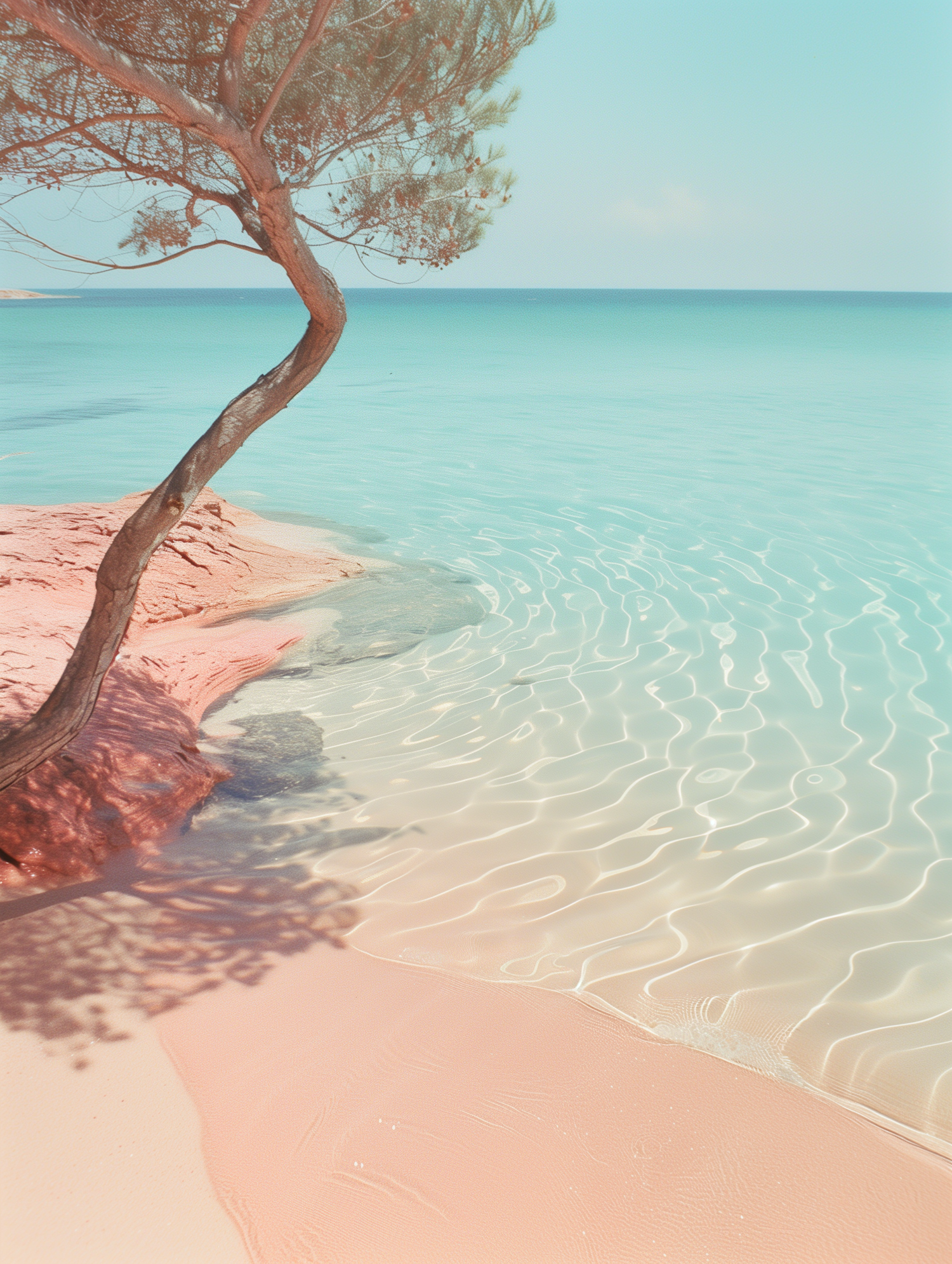 Serene beach with pink sand, clear turquoise water, and a lone tree casting shadows. Perfect for a tranquil escape.