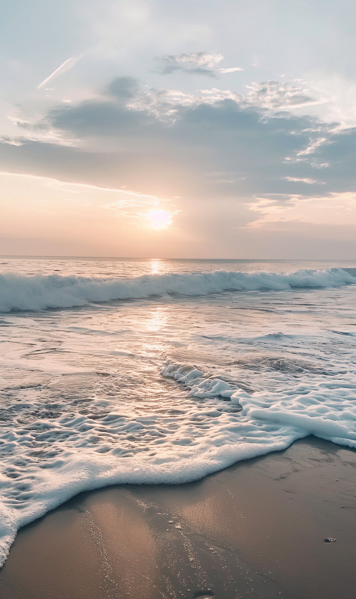 Serene sunset over ocean waves with golden reflections and soft clouds, creating a tranquil beach scene.