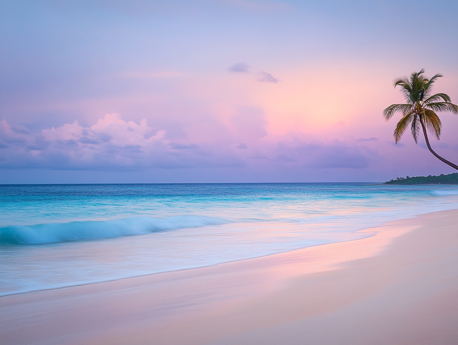A tranquil beach at sunset with pastel skies, gentle waves, and a leaning palm tree creating a serene tropical vibe.