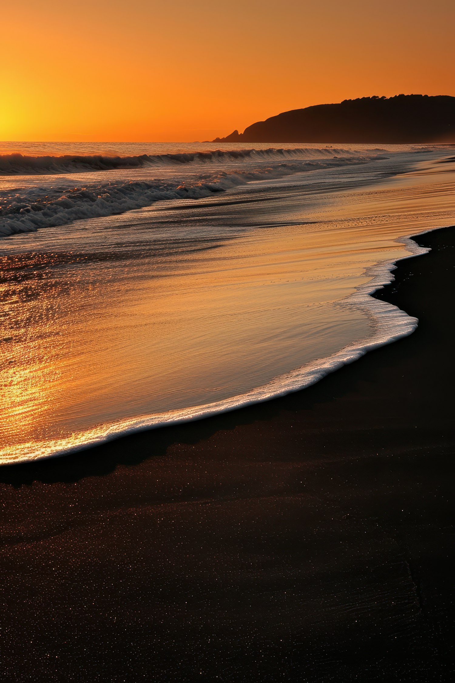 Golden sunset over a tranquil beach with gentle waves and a distant silhouette of a rocky hill, creating a serene and picturesque scene.