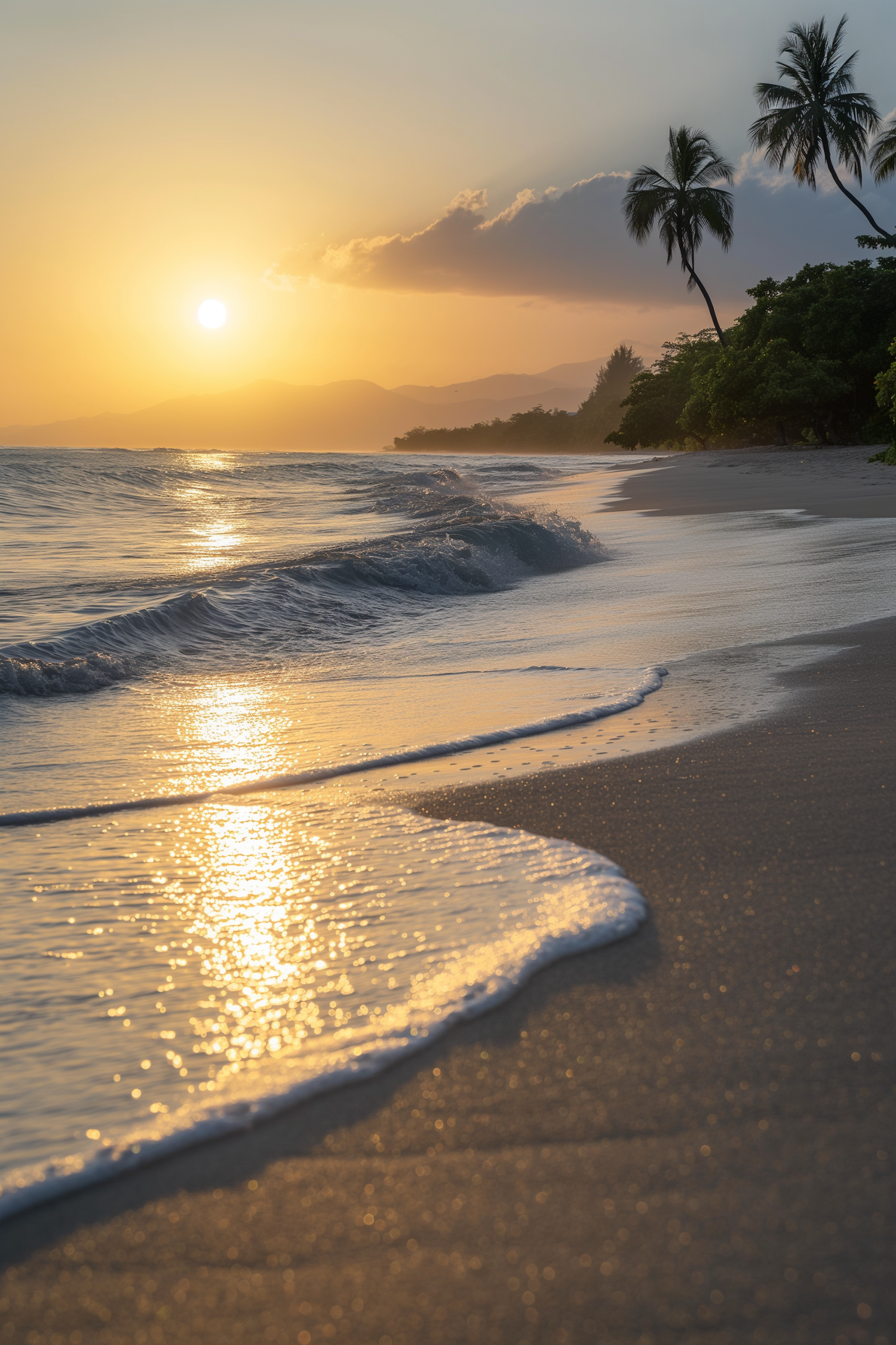 Tranquil beach sunset with gentle waves, golden sky, and silhouetted palm trees, creating a serene tropical atmosphere.