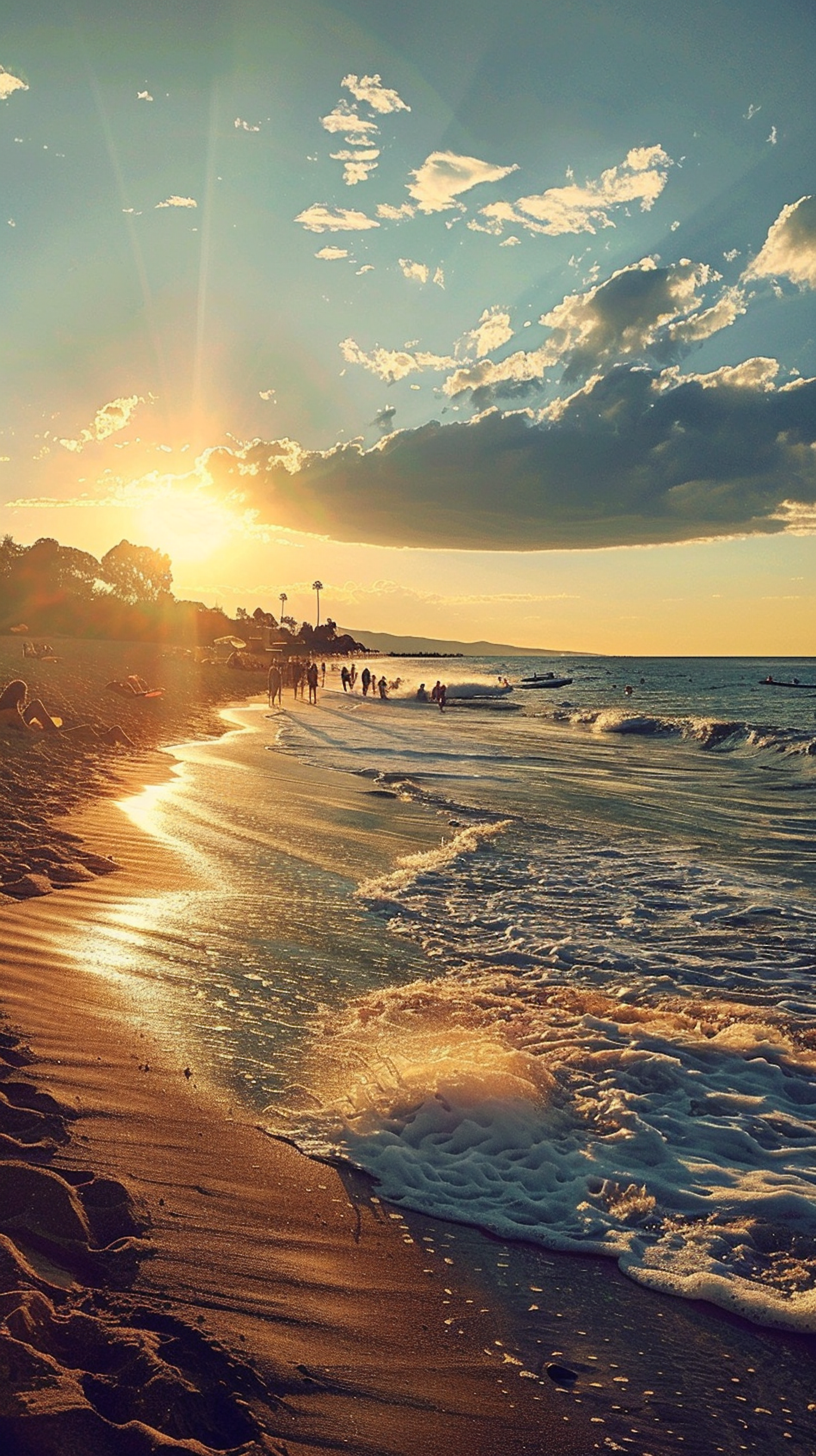 Serene beach sunset with golden light, gentle waves, and silhouettes of people enjoying the tranquil scene.